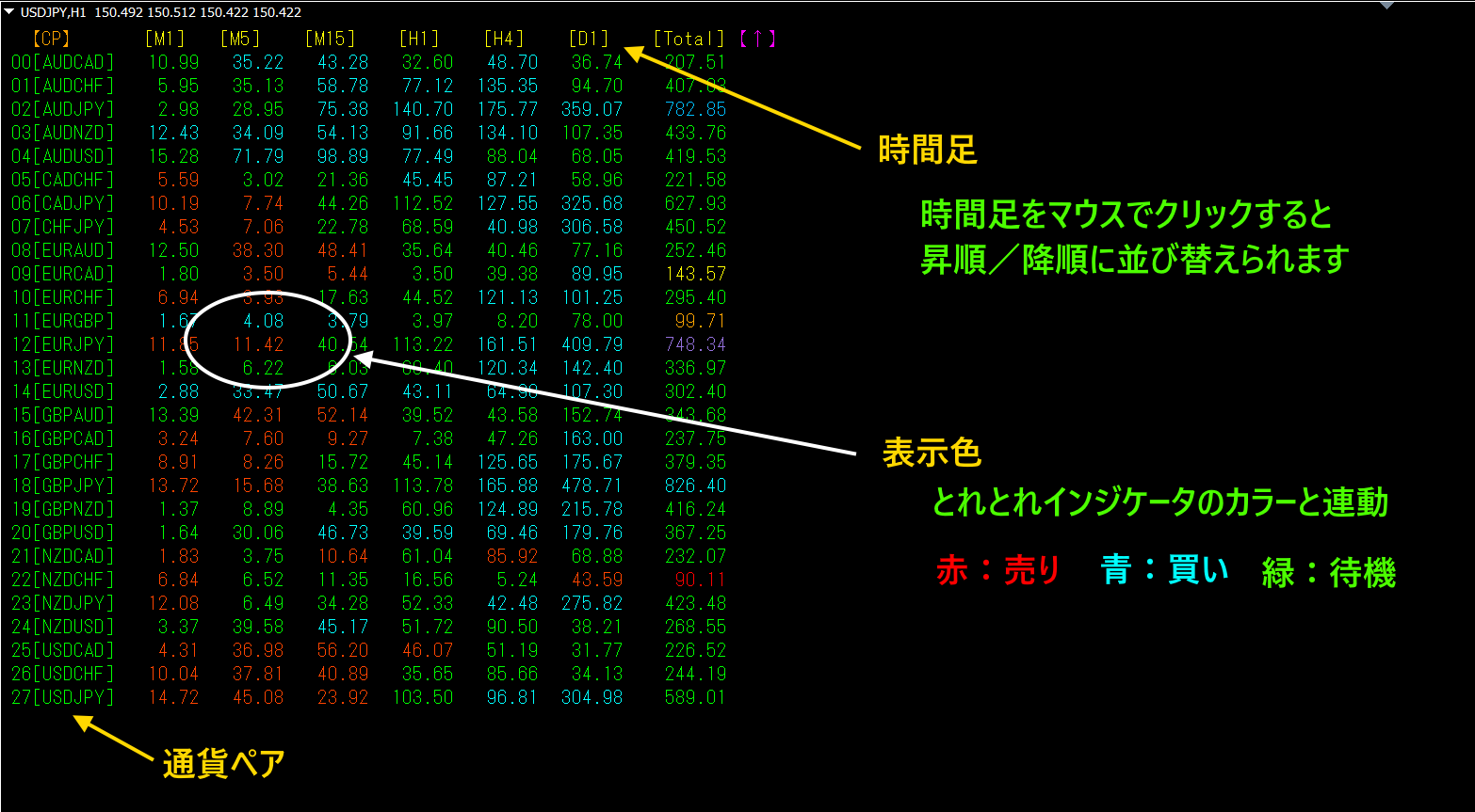 (イ) 数値は、時間足毎に、昇順/降順に並び替えられます。
