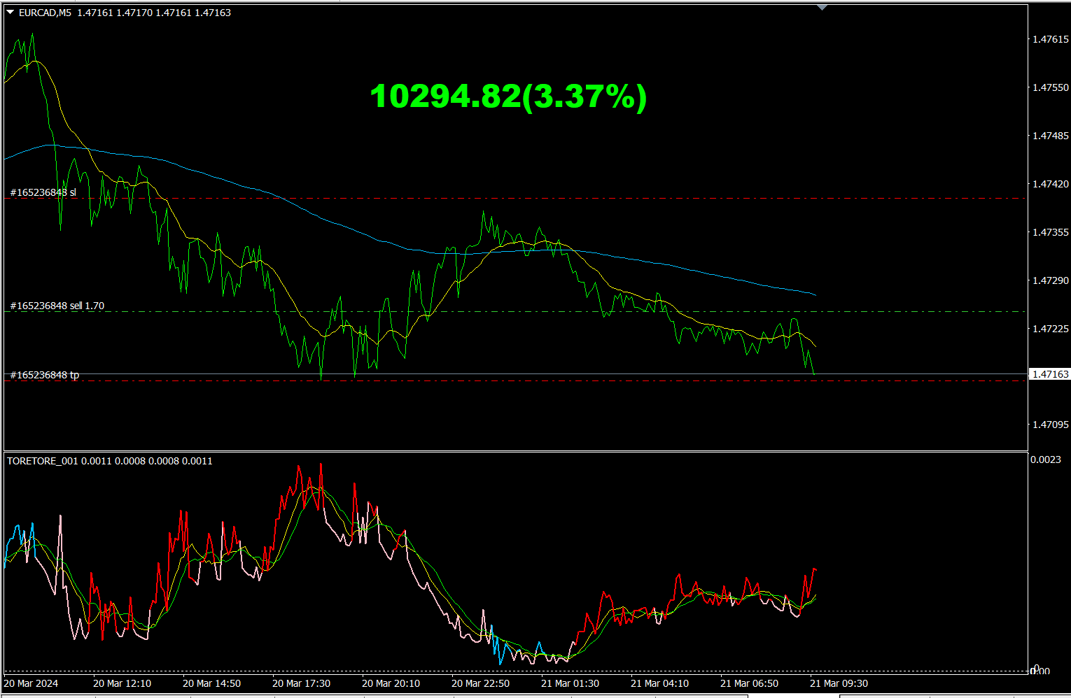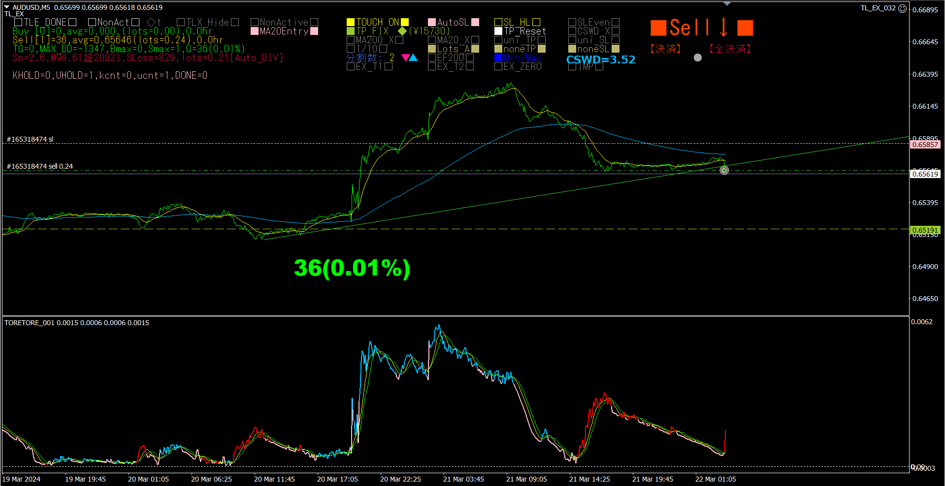 「TrendLine-EX」を使って、売りトレードを開始します。時間足は5分足です。ロット数は、自動ロット指定なので、「TrendLine-EX」にお任せです。分割数2でロット数が0.21になりました。