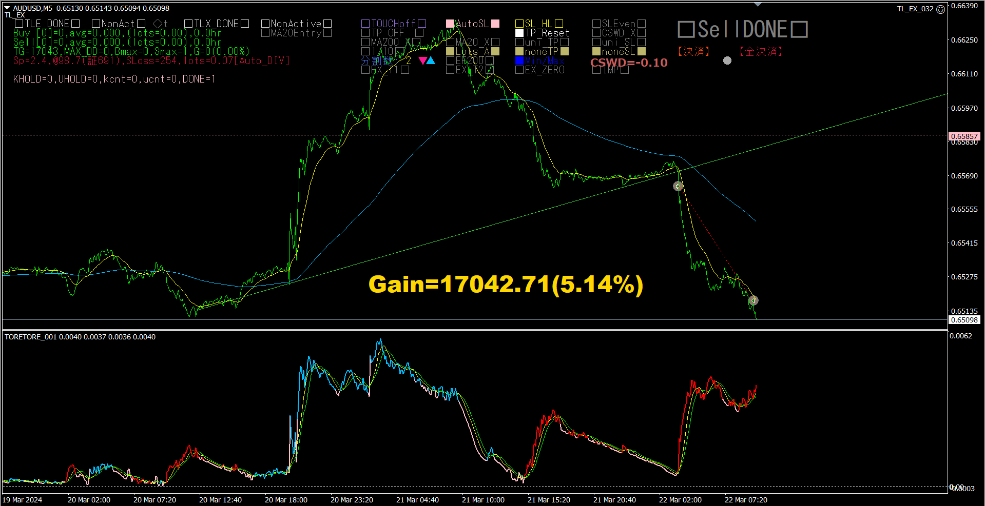 短時間で、AUDUSDのレートがスルスルと下がってきたので、「TrendLine-EX」により自動利確しました。