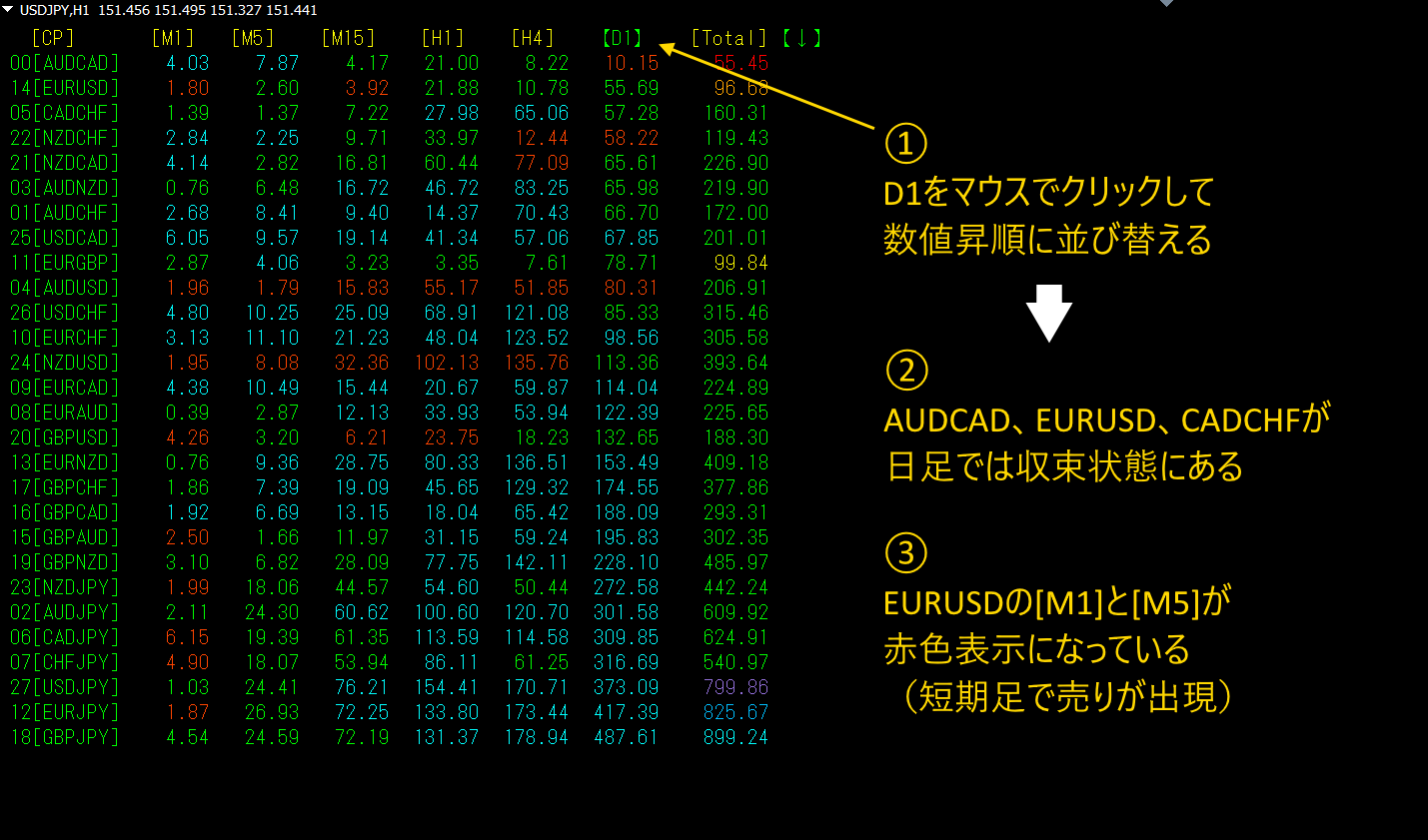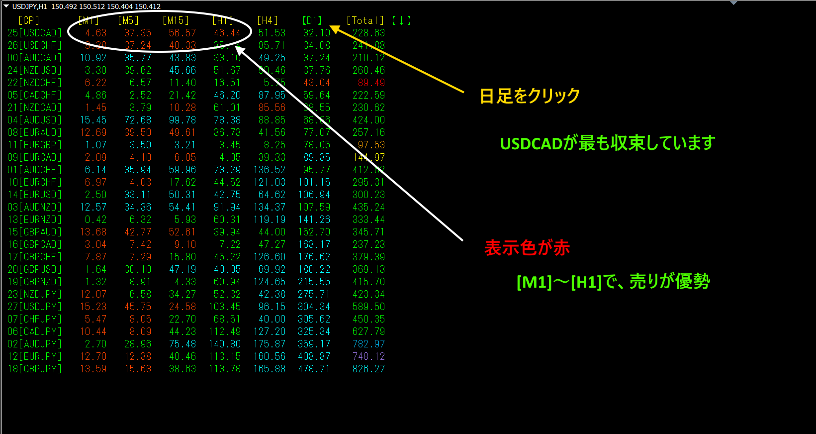 上の図は、[D1]をクリックして、日足の収束順に並び替えたものです。日足では、USDCADが最も収束しています。[M1]~[H1]のカラーが赤色なので、短期時間足で下落が発生していることも読み取れます。
