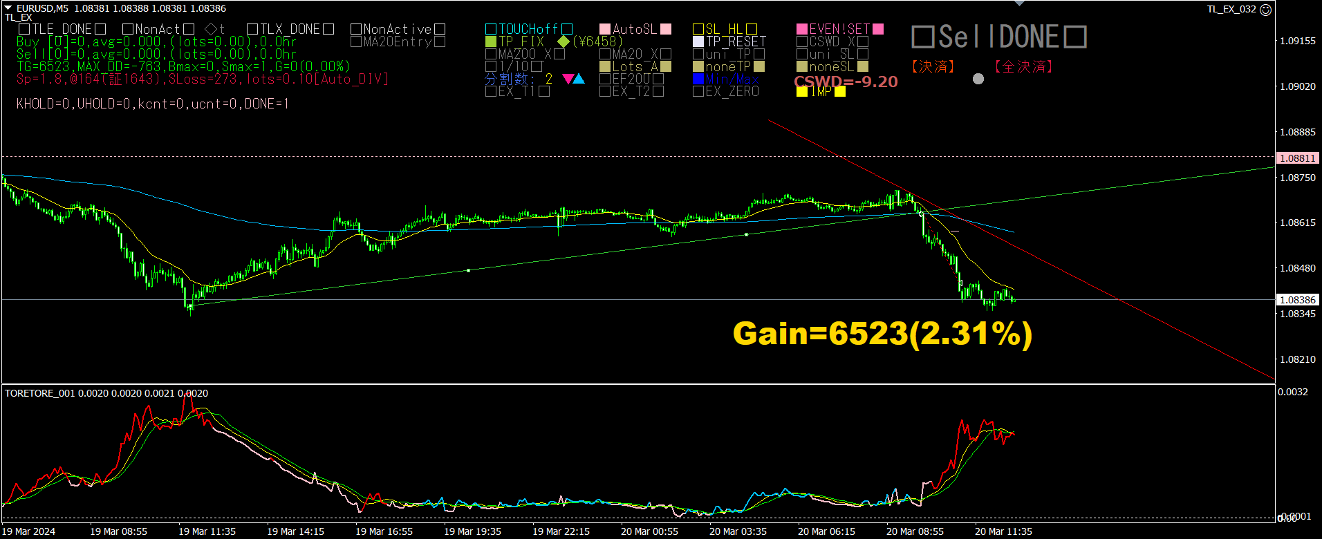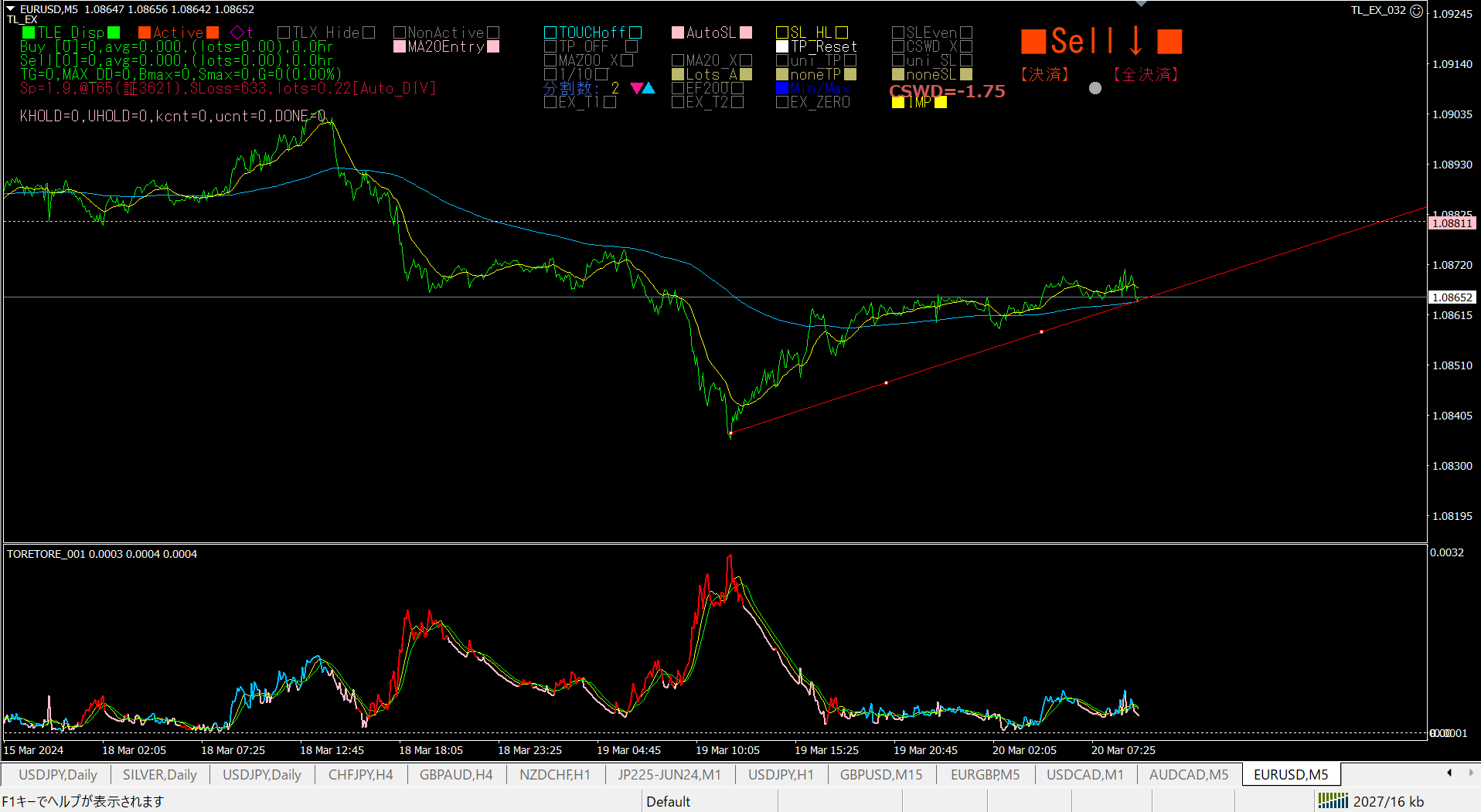 EURUSDの5分足チャートに、半自動EAの「TrendLine-EX」を導入します。5分足チャートでは、「とれとれインジケータ」では、まだメイン線が赤色になっていないのですが、「仕掛けて待つトレード」を行うことにします。