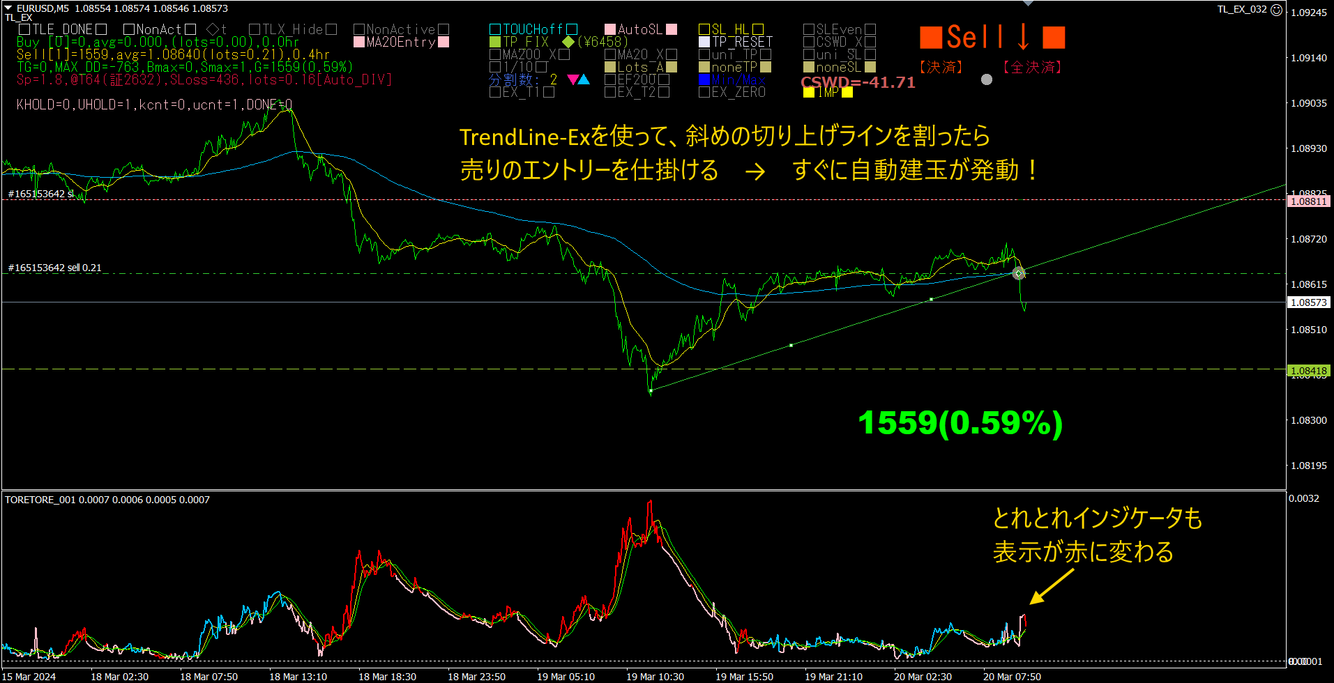 レートが大きく下がったので、売りエントリーが発動しました。この時、サブウィンドウの「とれとれインジケータ」のメイン線の色も赤に変わっています。