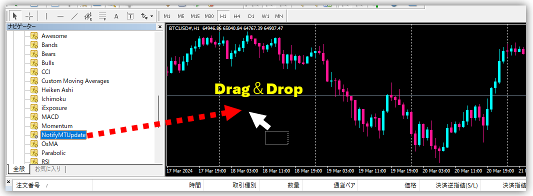 MTを再起動後に任意のチャートにインジケーター(NotifyMTUpdate)をドラッグ&ドロップして設置してください。