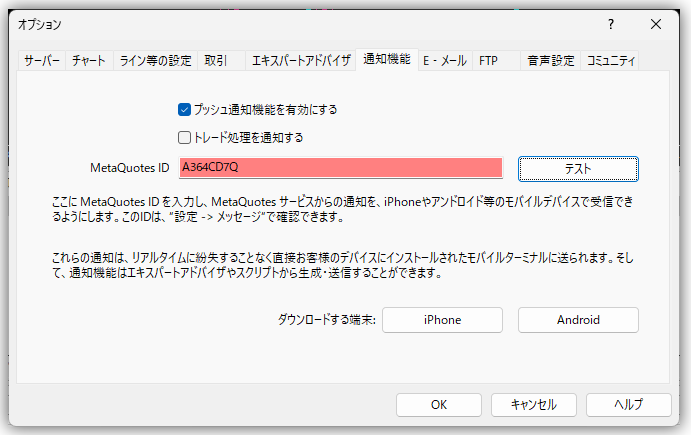 Push通知を受け取るためには、メニューの[ツール]-[オプション]でオプションダイアログを開いて、[通知]タブで、「プッシュ通知機能を有効にする」をチェックしたうえで、ご自身のスマホ版MT4/5で確認できるMetaQuotes IDを設定してください。