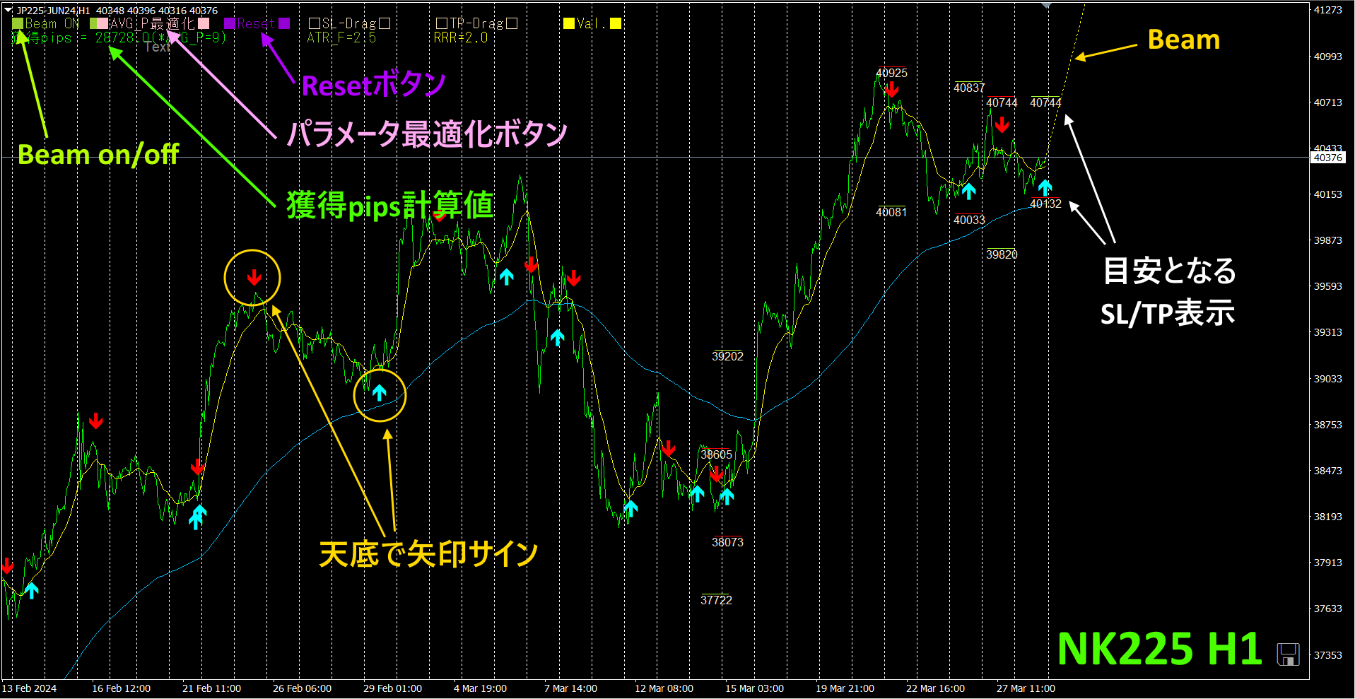 左上に ■Beam ON■ ボタンがあります。これをマウスでクリックすることで、チャートの右端からBeamを出す、出さないを選択できます。Beamの方向が上向きの場合、買いで、下を向いてきたら売りでトレードします。