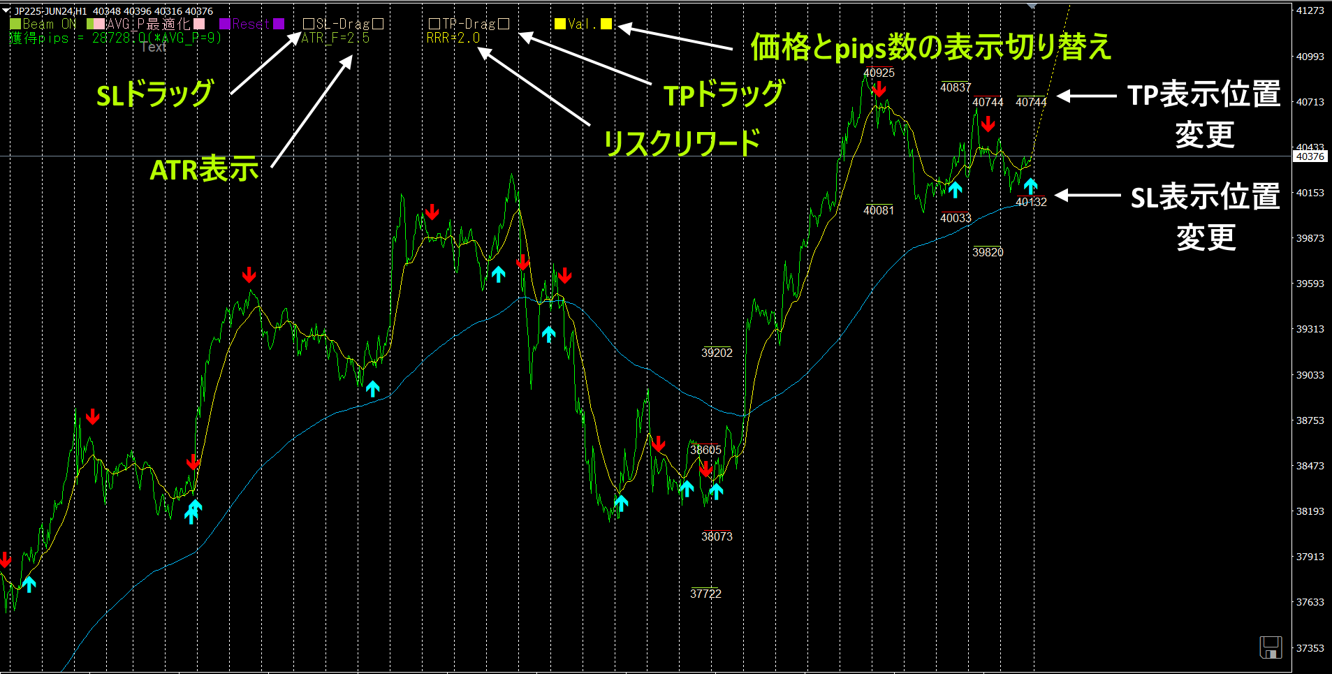 SL/TPの目安として、ATR(14)からSLを、リスクリワードが2になるようにTPを計算し、水平バーとして表示します。数値は、価格表示とpips表示を切り替えることができます。