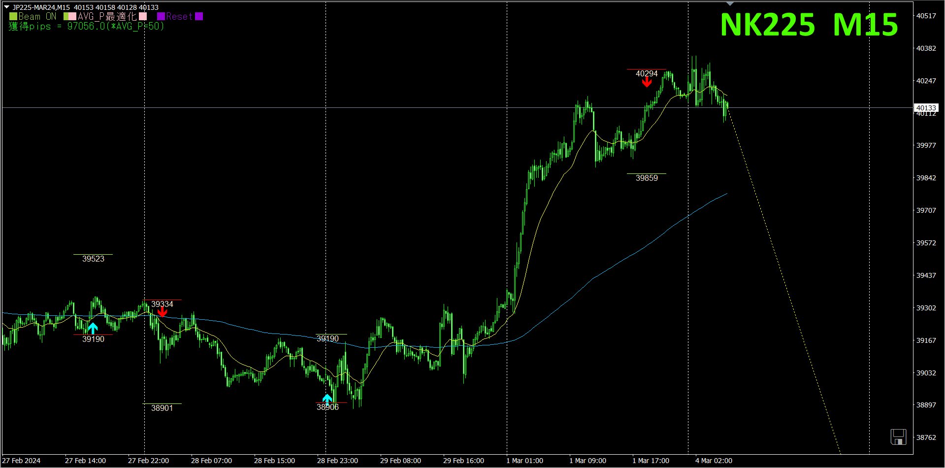 上の図は、NK225の15分足チャートで、パラメータ最適化を行ったものです。画面上に矢印が3本出現していますが、この矢印表示に従って、[売り] → [買い] → [売り] を繰り返すことで、大きな利益が得られます。