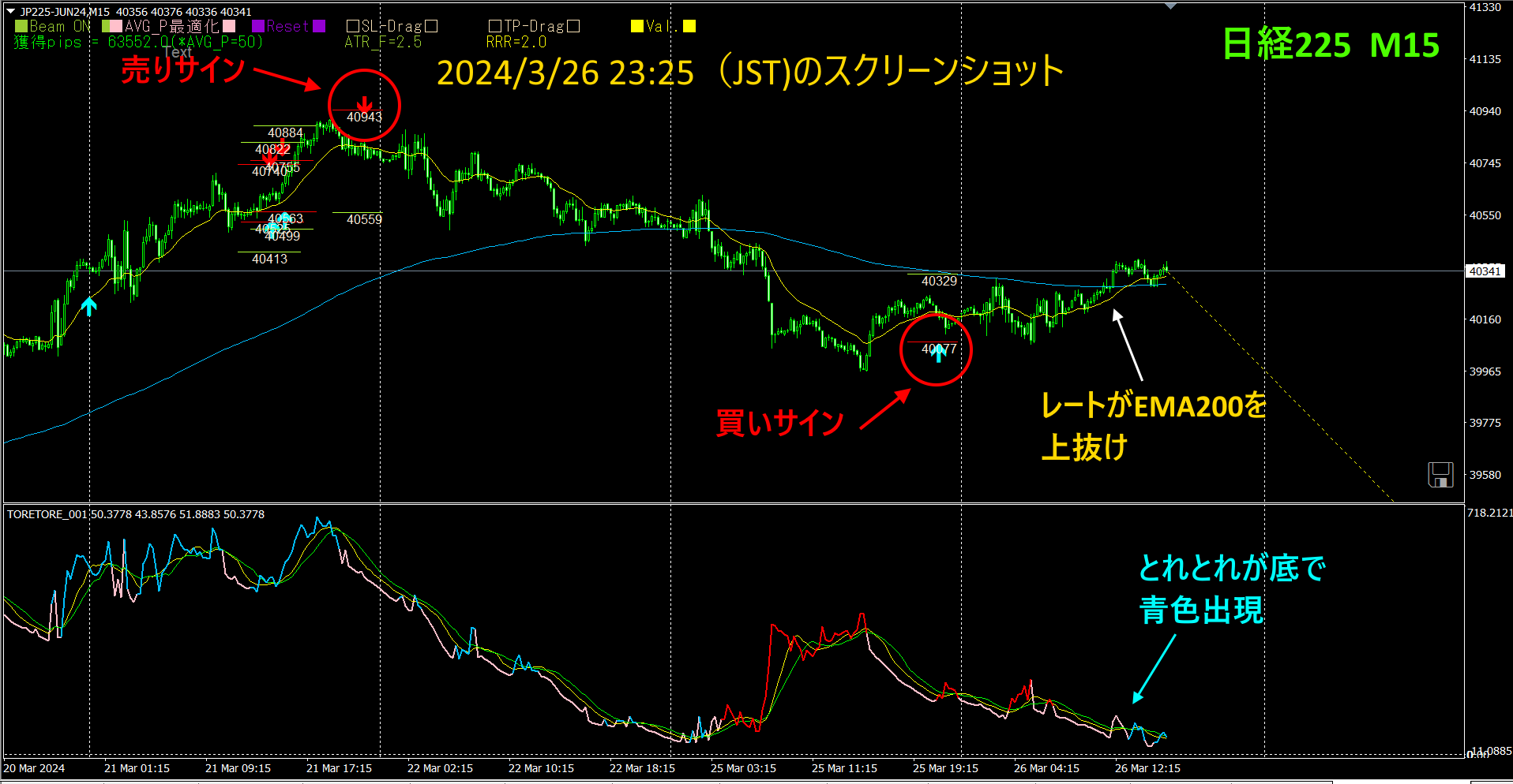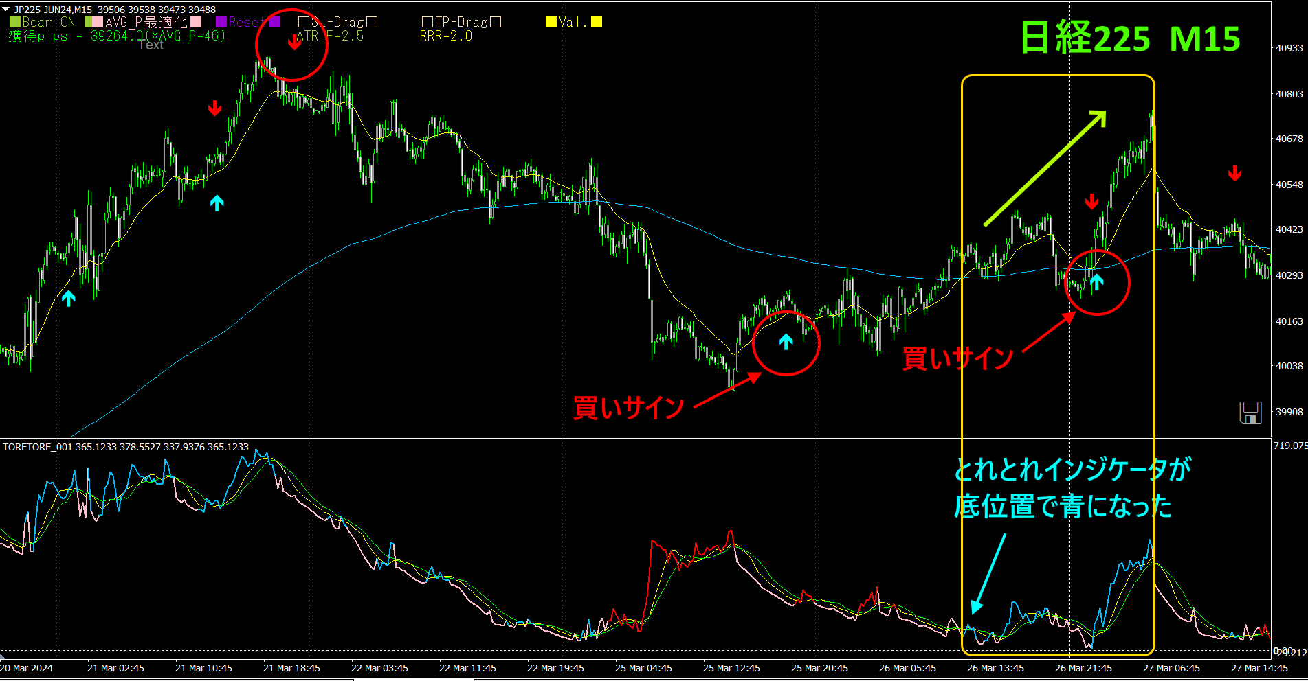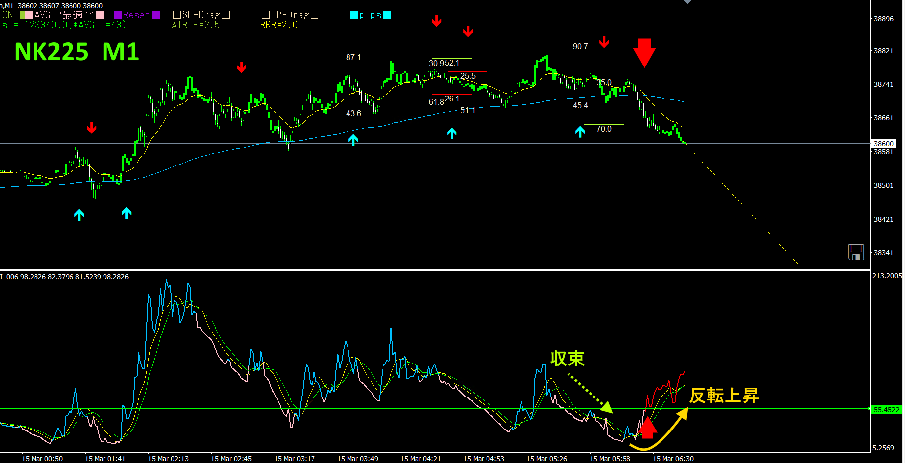 NK225の全体的な動向を把握する為に、「とれとれインジケータ」との併用が効果的です。「とれとれインジケータ」は、NK225のチャートの乖離/収束の状態と、今現在トレードすべきか否かを教えてくれます。「とれとれインジケータ」のメイン線が充分収束して(底に近い位置になって)からの反転上昇部分のみを狙います。ここでメイン線が赤なら売りで、青なら買いでトレードします。