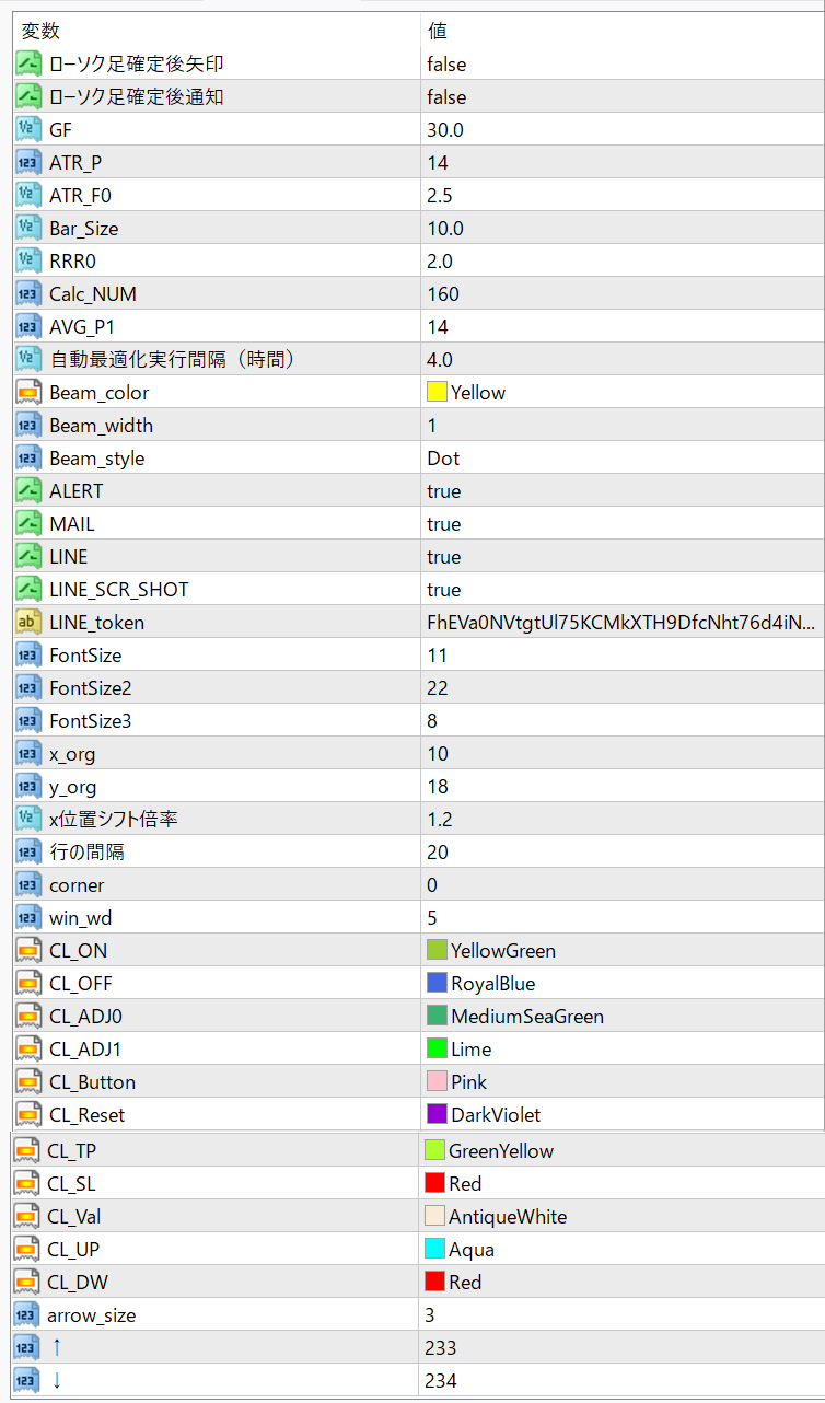 また自動最適化機能により、一定時間間隔で自動最適化が実行されます。最適化が実行されると、パラメータが変更されることがあり、チャートの矢印が再描画されます。最適化後の矢印表示に従ってトレードを行ってください。