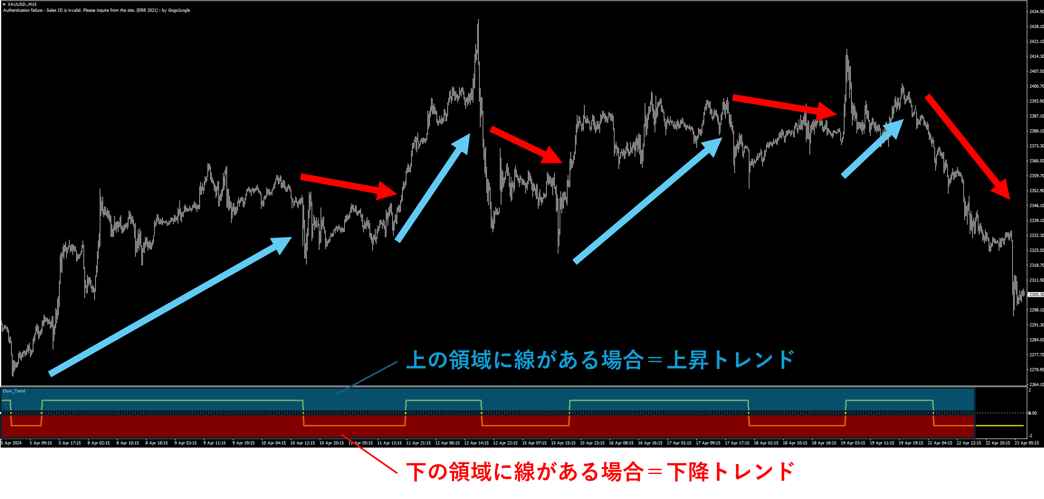 下記のオシレータ(黄色線)がダウ理論の上昇トレンド、下降トレンドを表示します。 ダウ理論の波形認識は、下記商品に基づいています。 https://www.gogojungle.co.jp/tools/indicators/50668