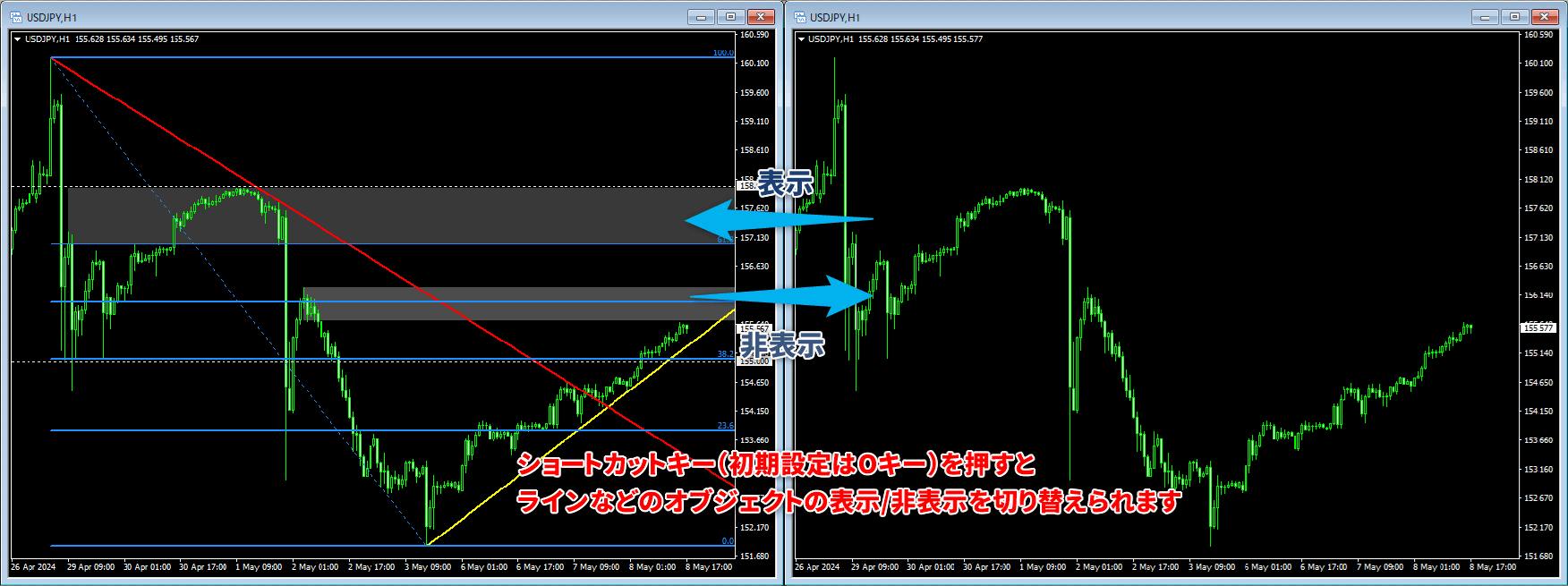 ラインなどのオブジェクトの表示/非表示をショートカットキーで切り替えるインジケーター(MT4用)。