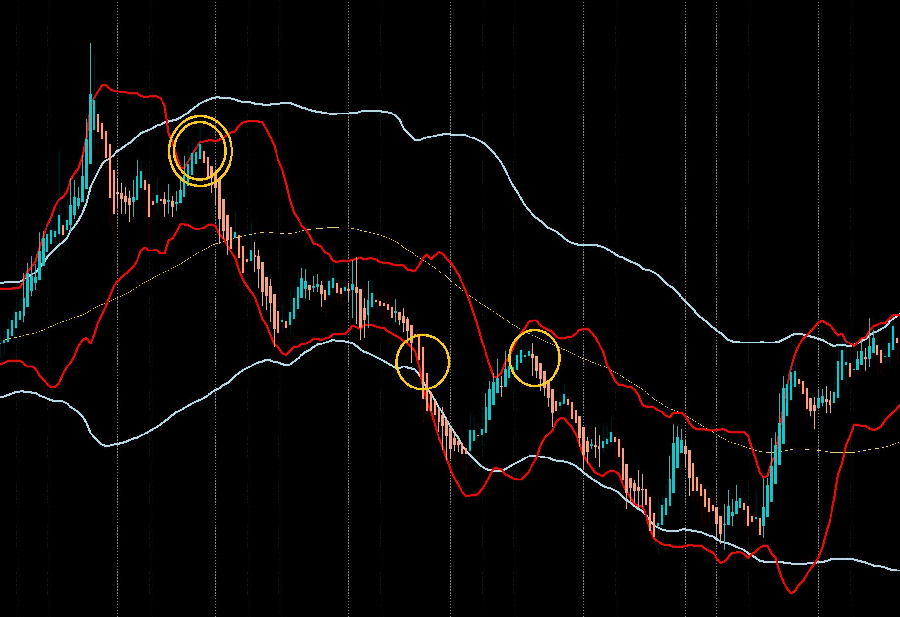 赤いボリンジャーバンドのライン(曲線)でローソク足が反転しているのがわかります。