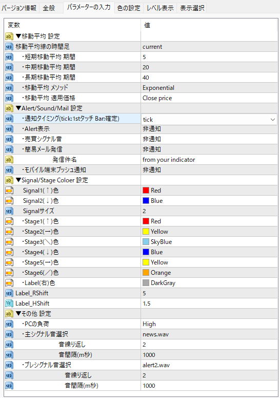 ・Alert、メール、モバイルへの通知情報は時刻 通貨ペア 時間軸 <サイン種類> サイン時の価格 @インジケータ (Tick/Bar)