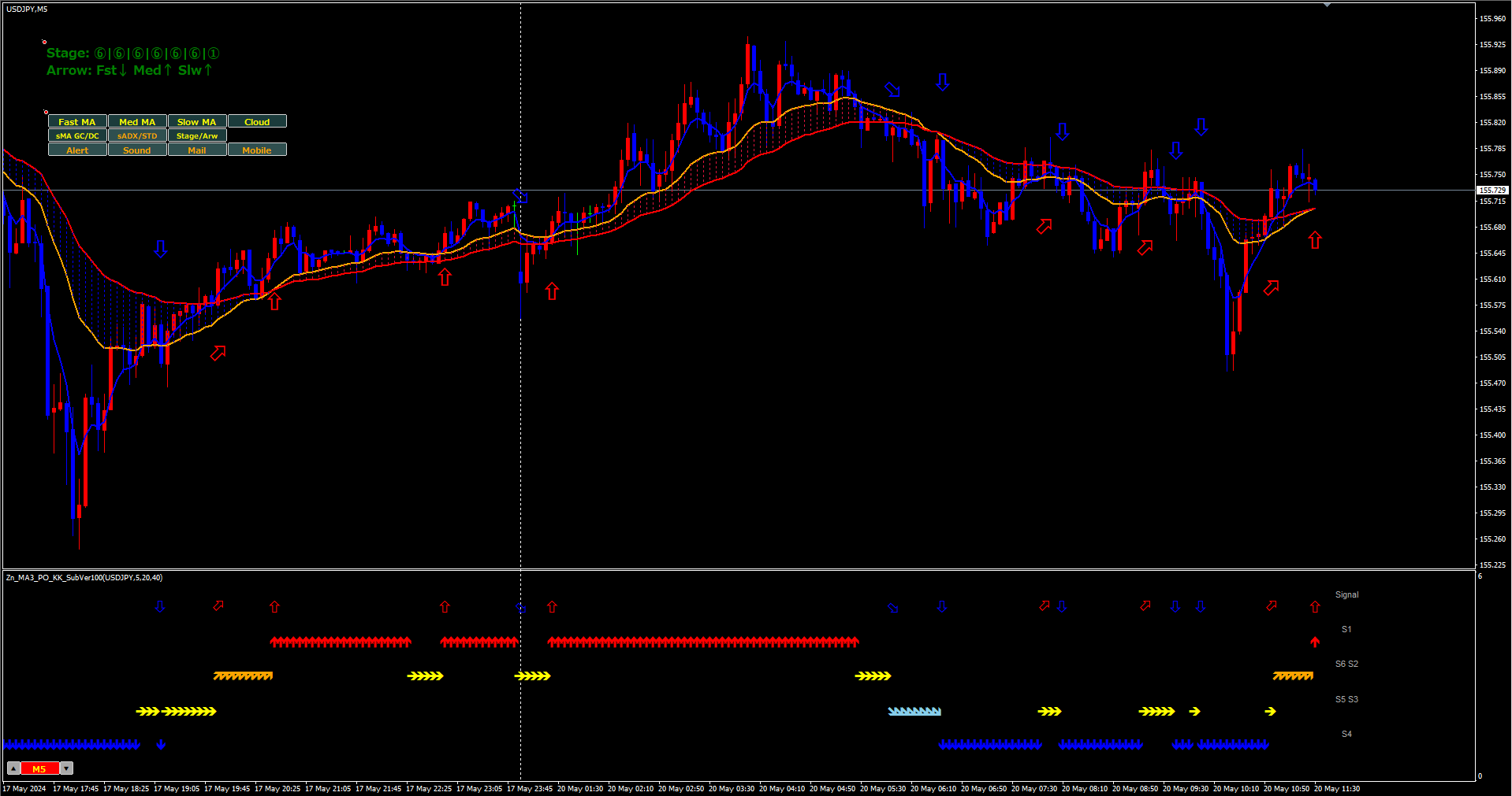 なお、当インジケータは移動平均大循環分析の個々時間足での結果(ステージ)を矢印でサブウィンドウにプロットします。 メインのウィンドウには利用者様お気に入りのインジケータを表示できます。