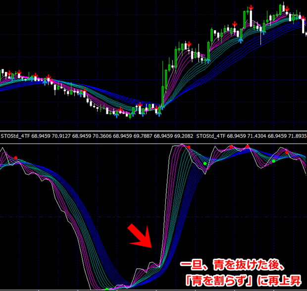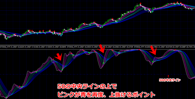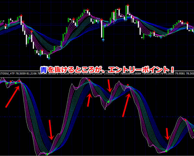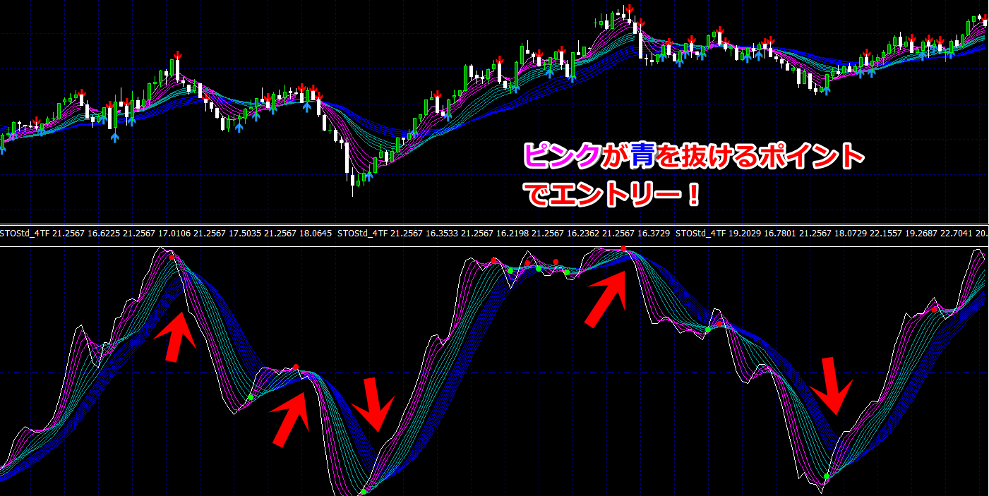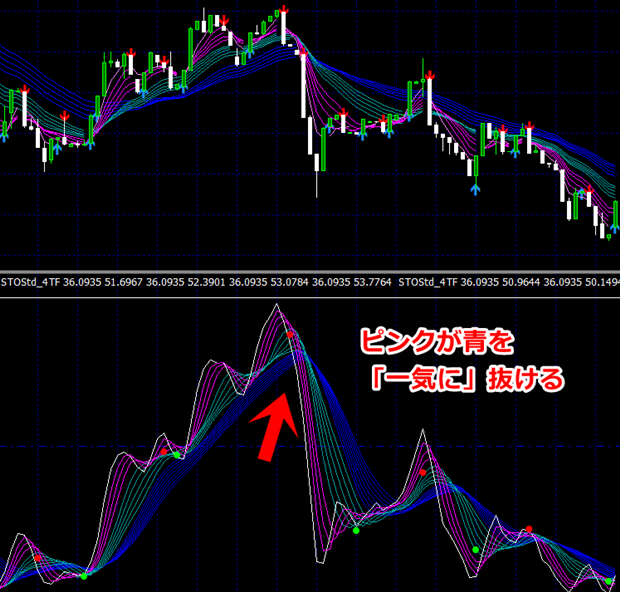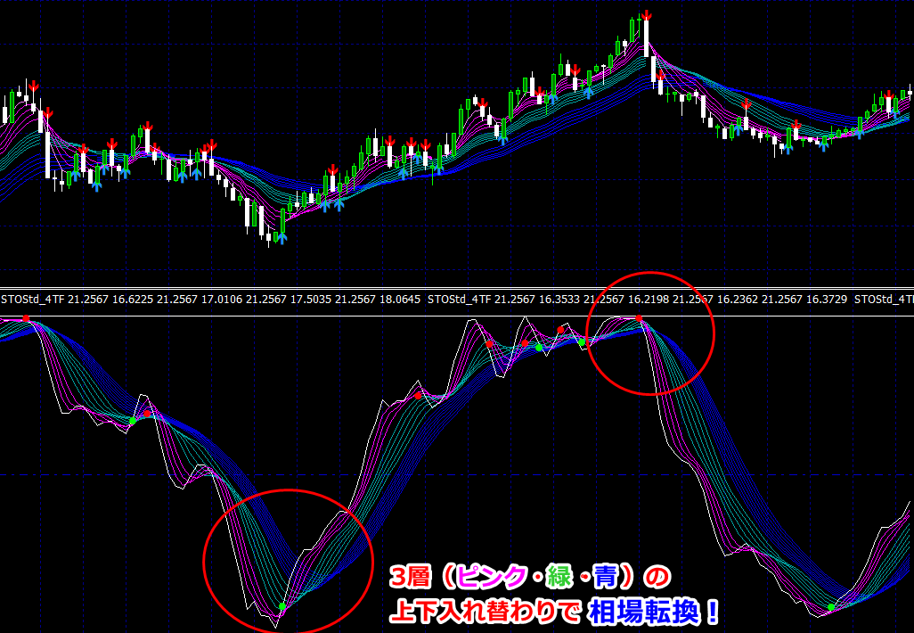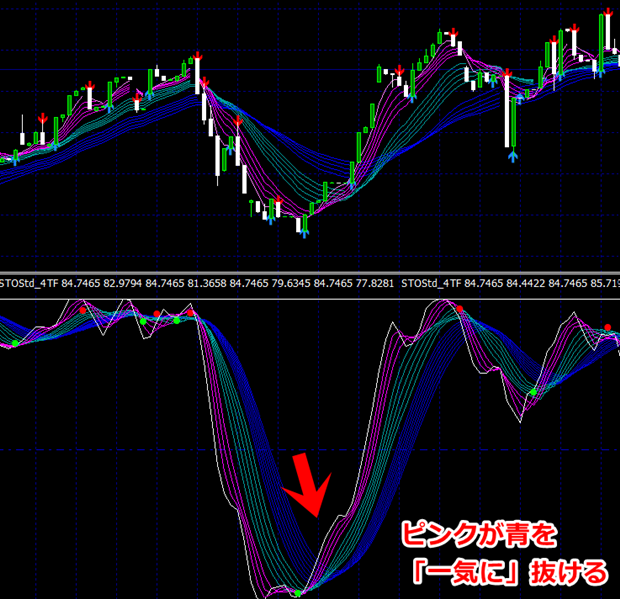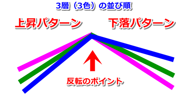 インジケーターの帯はピンク3層構造で、3層の帯は、収斂と拡散を繰り返しますので、 上昇時は、上から ピンクの並びとなり、下落時は、その逆で、上から青・緑・ピンクの並びになります