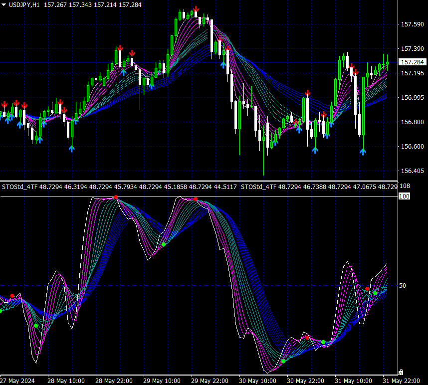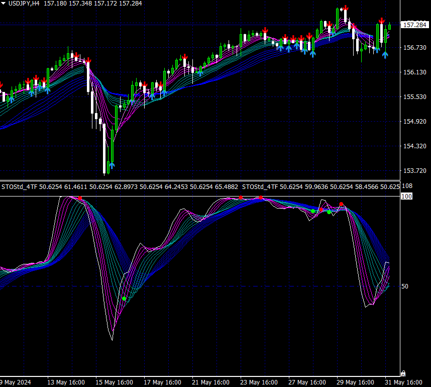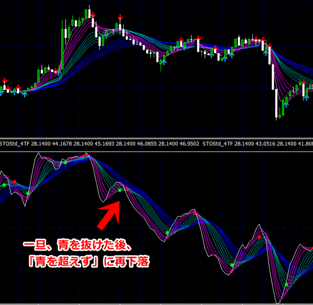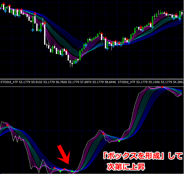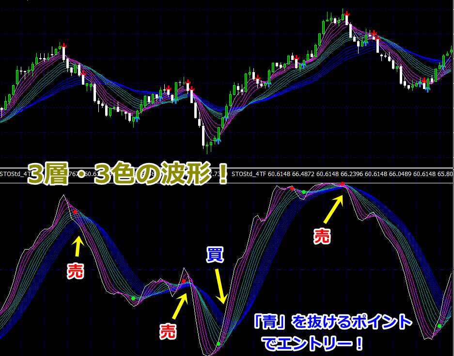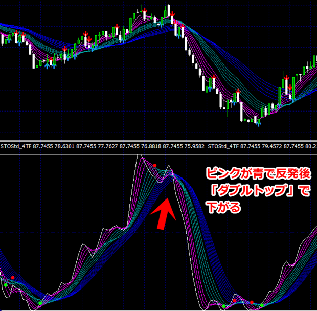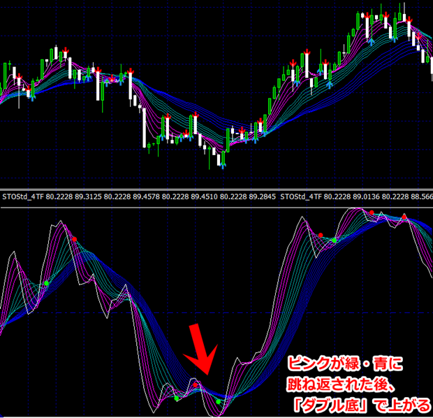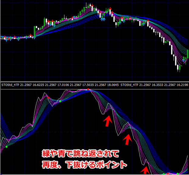 インジケーターの帯はピンク3層構造で、3層の帯は、収斂と拡散を繰り返しますので、 上昇時は、上から ピンクの並びとなり、下落時は、その逆で、上から青・緑・ピンクの並びになります