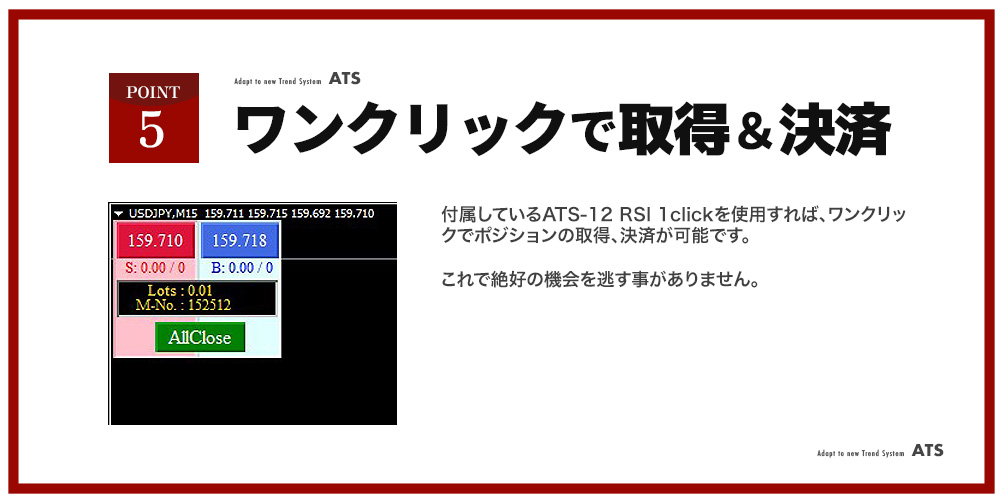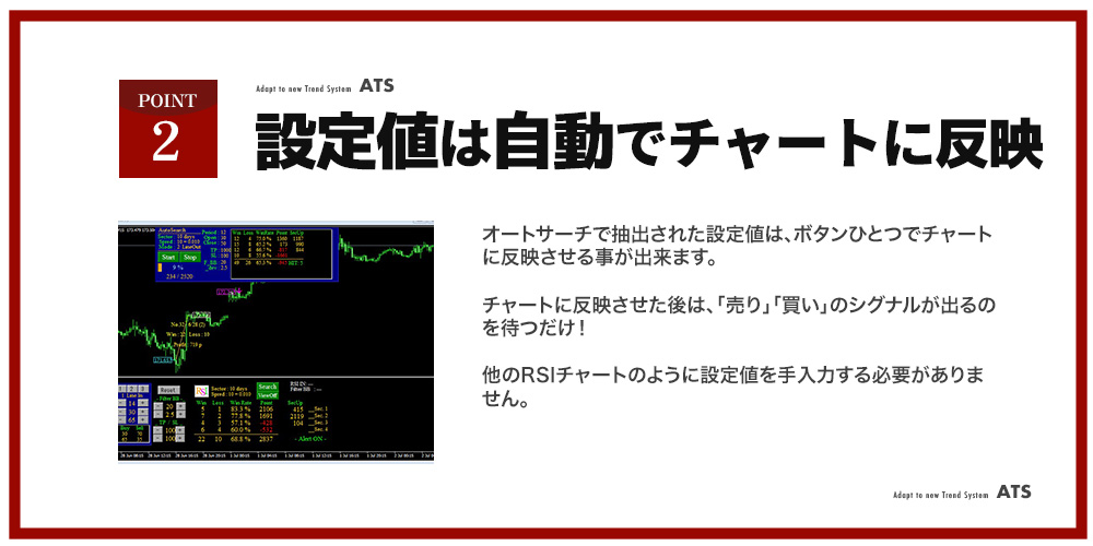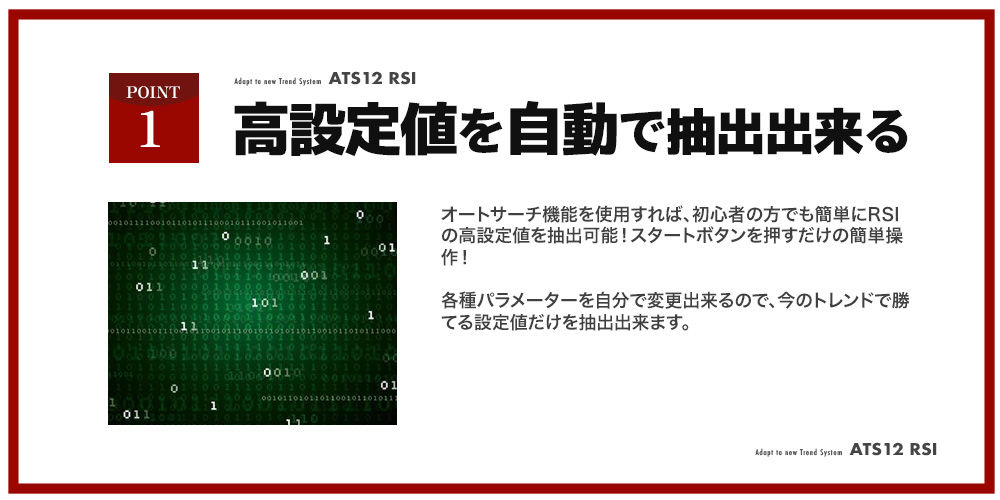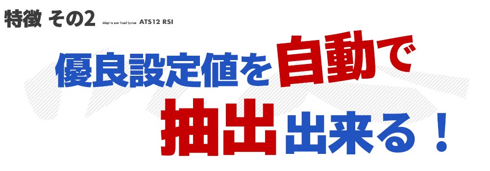 ATS-12 RSIのAutoSearch(オートサーチ)機能。今のトレンドに対応出来るする事が出来ます。トレードの効率化、正確性の向上を飛躍的に押上げ、あなたのFXトレードを飛躍的に加速させてくれます。