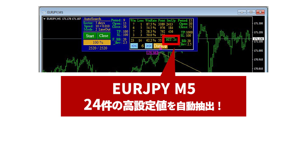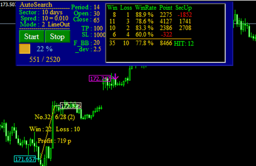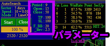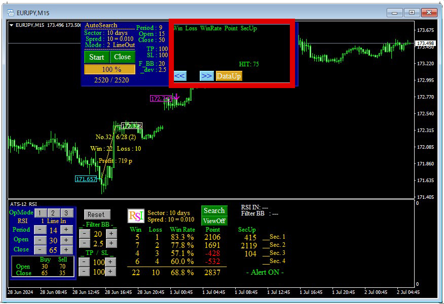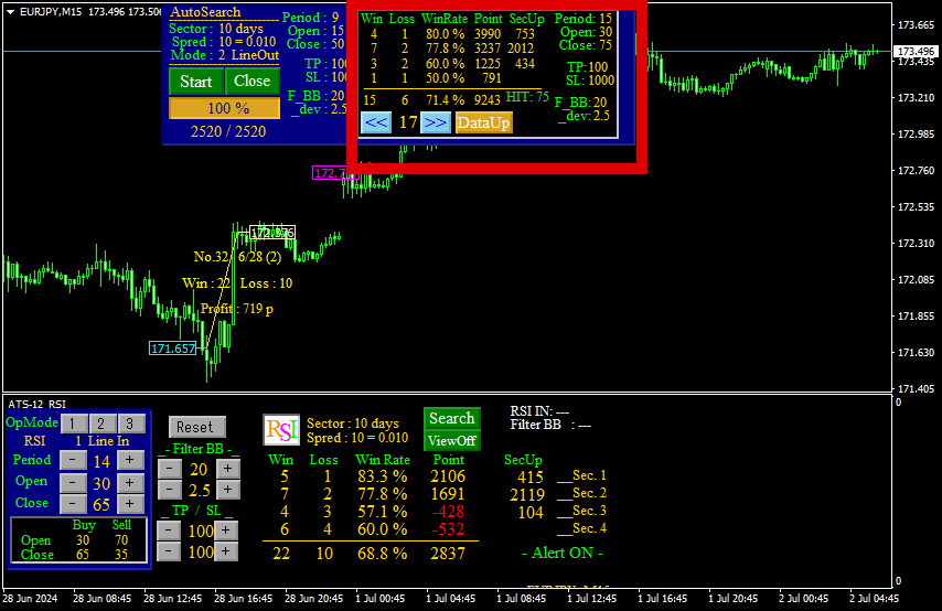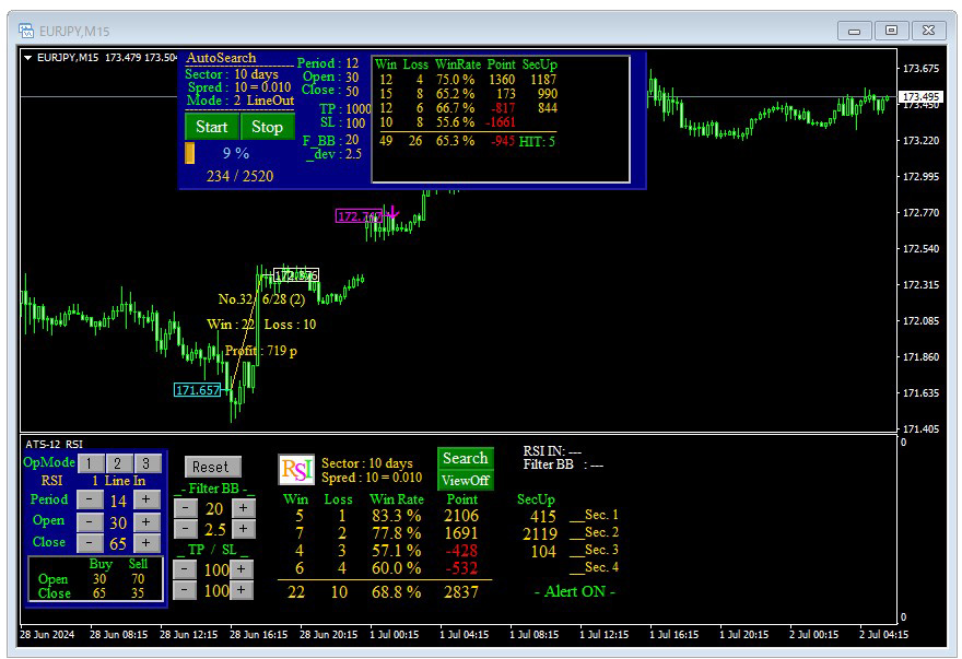 ATS-12RSIと付属のAutoSearchをチャートにセットして… AutoSearchのスタートボタンを押し検索スタートさせてしばらくした画面がこちらです。 上フレームの青い背景の部分がオートサーチです。 スタートボタンを押すだけで自動で設定値のバックテストを開始してくれます。