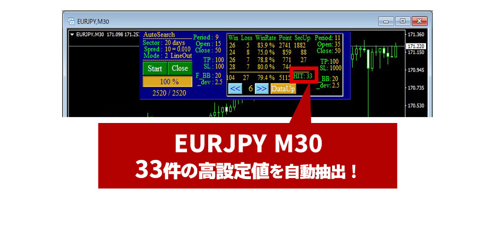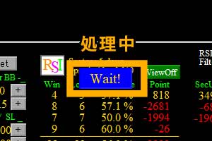 設定を変更した際に計算を行っている間、一時的に表示されます。 (通常は0.3秒~1秒くらい。バックテストのように数分も待ちません。) この表示が消えれば次の操作を行っていただいてOKです。高設定値を自動で検出するシステムです。また、指定した条件をクリアしたデータを次々とデータベースへ保存していきます。 パラメータを設定して「Start」ボタンを押せば、あとは待つだけ。 画像イメージの場合では、「Start」ボタンを押してから少し待った後に結果が出た状態です。「2,520パターンの検証を行い、パラメータで指定した以上の高設定値が33件あった」ということがわかります。
