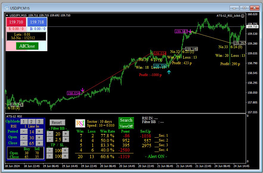 このインディケーターATS-12 RSIでは、 現在のトレンドに適した優れた設定値を 数十分で抽出する事が可能です。抽出された設定値は、数千パターンのシミュレーションと 徹底的なバックテストを経ており、 過去の様々な市場状況においても 一貫して高いパフォーマンスを発揮しています。