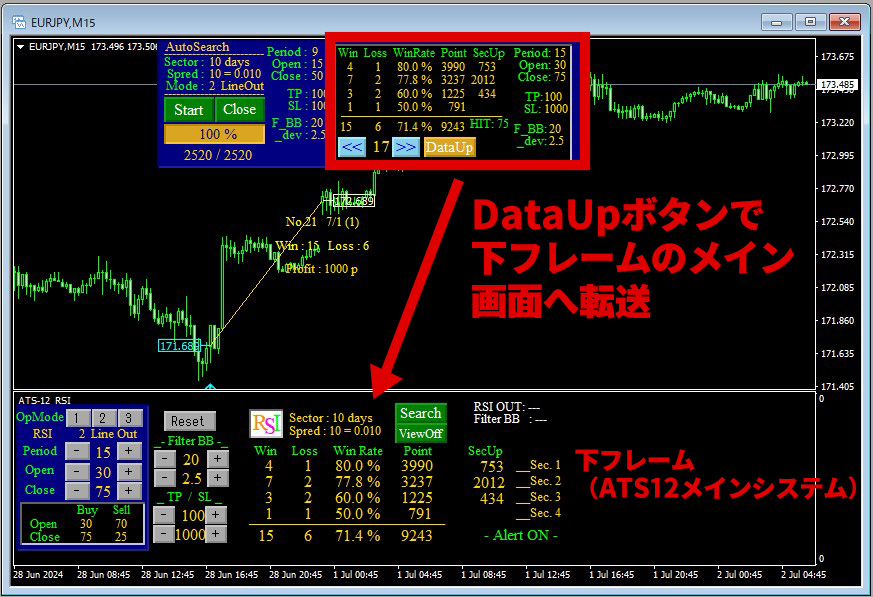 抽出した優良な設定値は「DataUp」ボタンを押すと下のフレーム(ATS12本体)に自動で転送されます。 >転送された設定値は、すぐにチャートに反映されます。 つまりこのまま「売り・買いのシグナル」が出るのを待てば良いのです。
