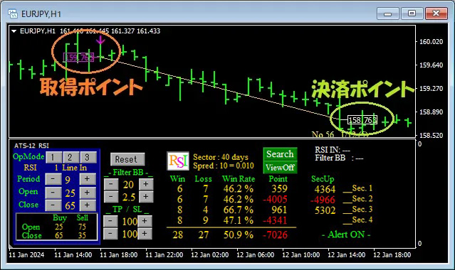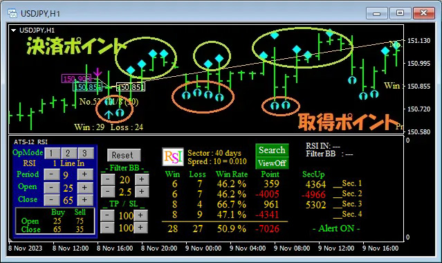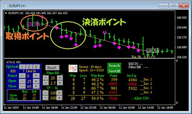 その点を踏まえ、ATSでは各サインはとにかく分かりやすくなっています。では具体的に『ATS-12 RSI』の取得決済のサインを見ていきましょう。