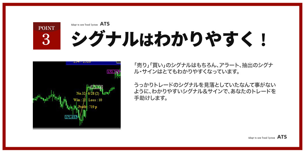 そこで過去のデータ、更には現在の状況からたくさんのデータを集計分析し、より効率よく成果をあげられる方法を見出すことが大切なのです。 また時期がきたらそれを更新していき、いつも新しいトレンドに適応していくというのがこのトレード手法であり、『ATS』の基本的な頭脳です。 そこで最大限に力を与えてくれるのがこのATS(=Adapt To New Trend System.)なのです。