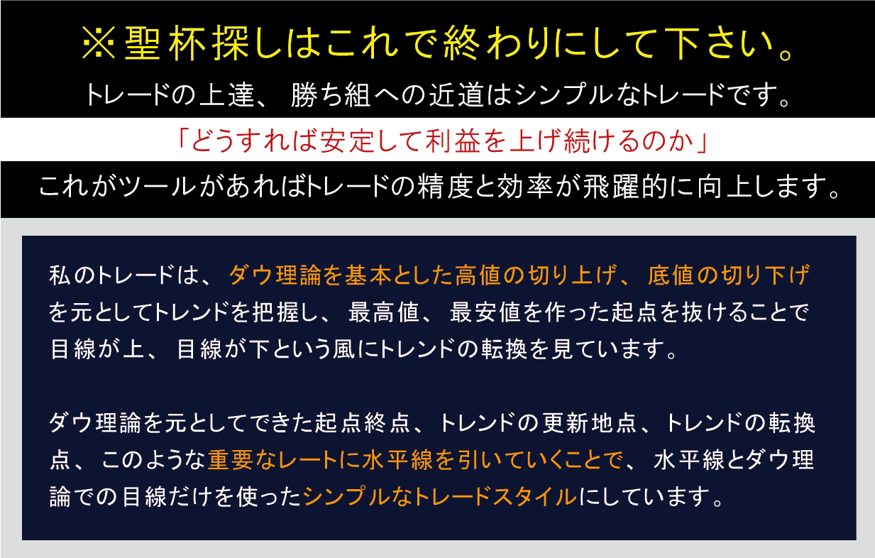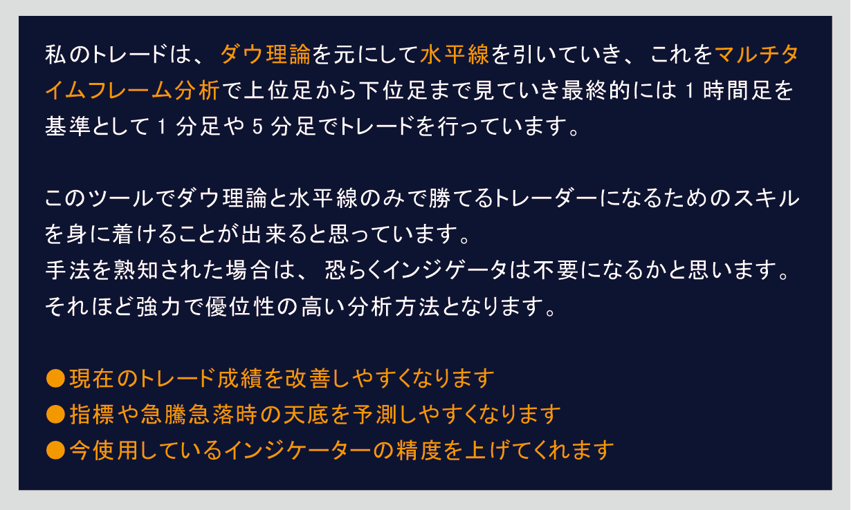 このツールでダウ理論と水平線のみで勝てるトレーダーになるためのスキルを身に着けることが出来ると思っています。