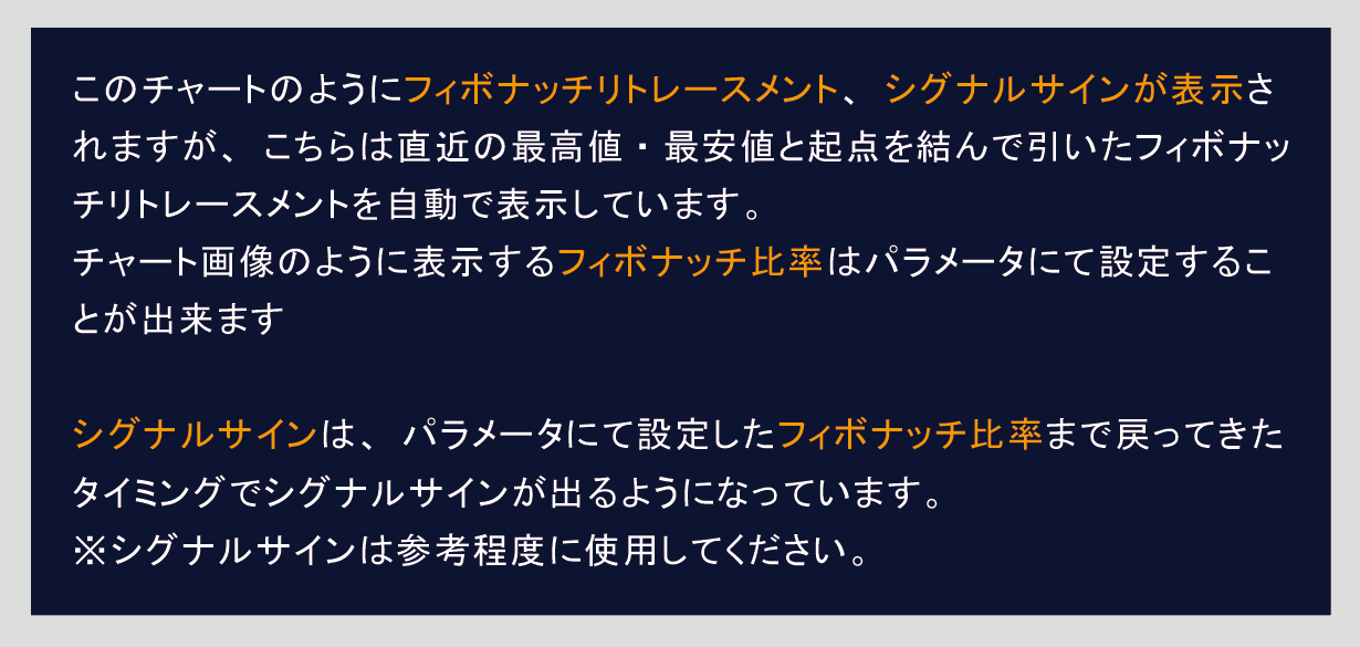 フィボナッチリトレースメント、シグナルサインが表示されますが、こちらは直近の最高値・最安値と起点を結んで引いたフィボナッチリトレースメントを自動で表示しています。