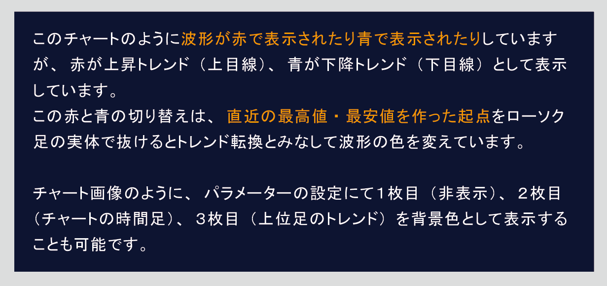 この赤と青の切り替えは、直近の最高値・最安値を作った起点をローソク足の実体で抜けるとトレンド転換とみなして波形の色を変えています。