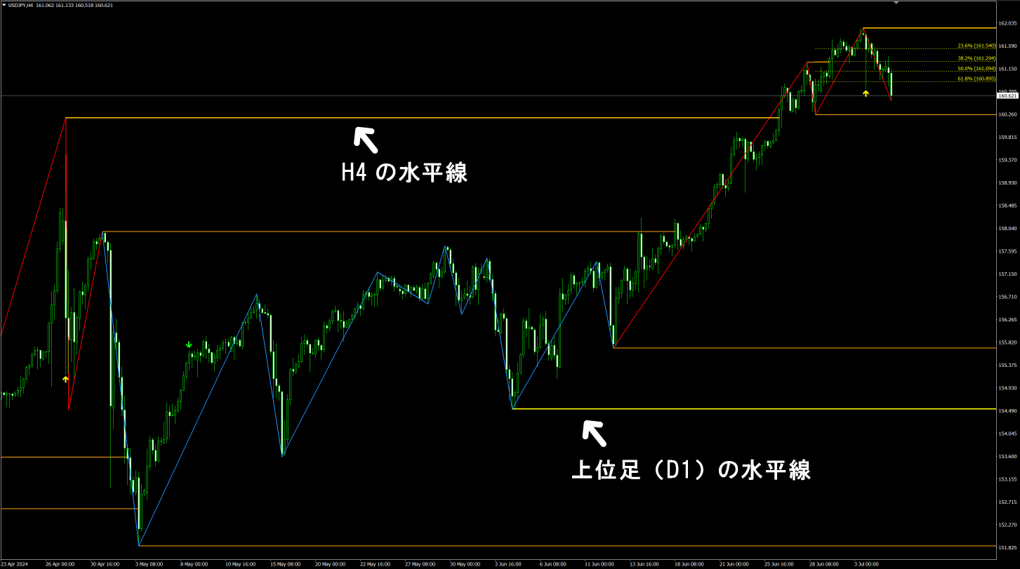 上記のようなダウ理論を元としてできた起点終点、トレンドの更新地点、トレンドの転換点、このような重要なレートに水平線を引いていくことで、水平線とダウ理論での目線だけを使ったシンプルなトレードスタイルにしています。