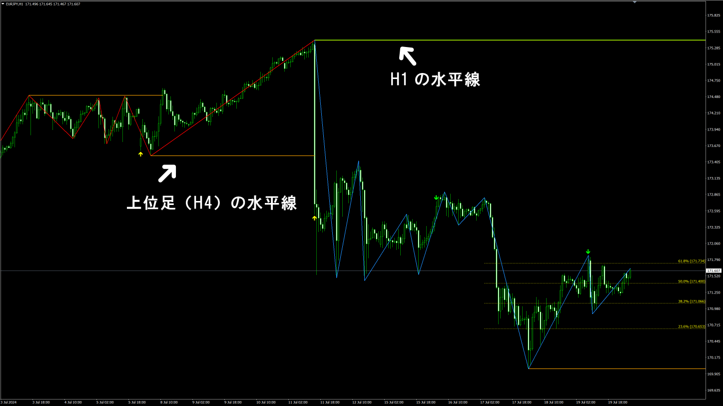 水平線とフィボナッチリトレースメントを組み合わせることで、さらに精度の高いトレードが可能になります。フィボナッチレベルが水平線と重なる場合、その価格レベルは特に強力なサポートまたはレジスタンスとして機能することがあります。