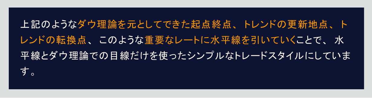 ダウ理論を元としてできた起点終点、トレンドの更新地点、トレンドの転換点、このような重要なレートに水平線を引いていくことで、水平線とダウ理論での目線だけを使ったシンプルなトレードスタイルにしています。