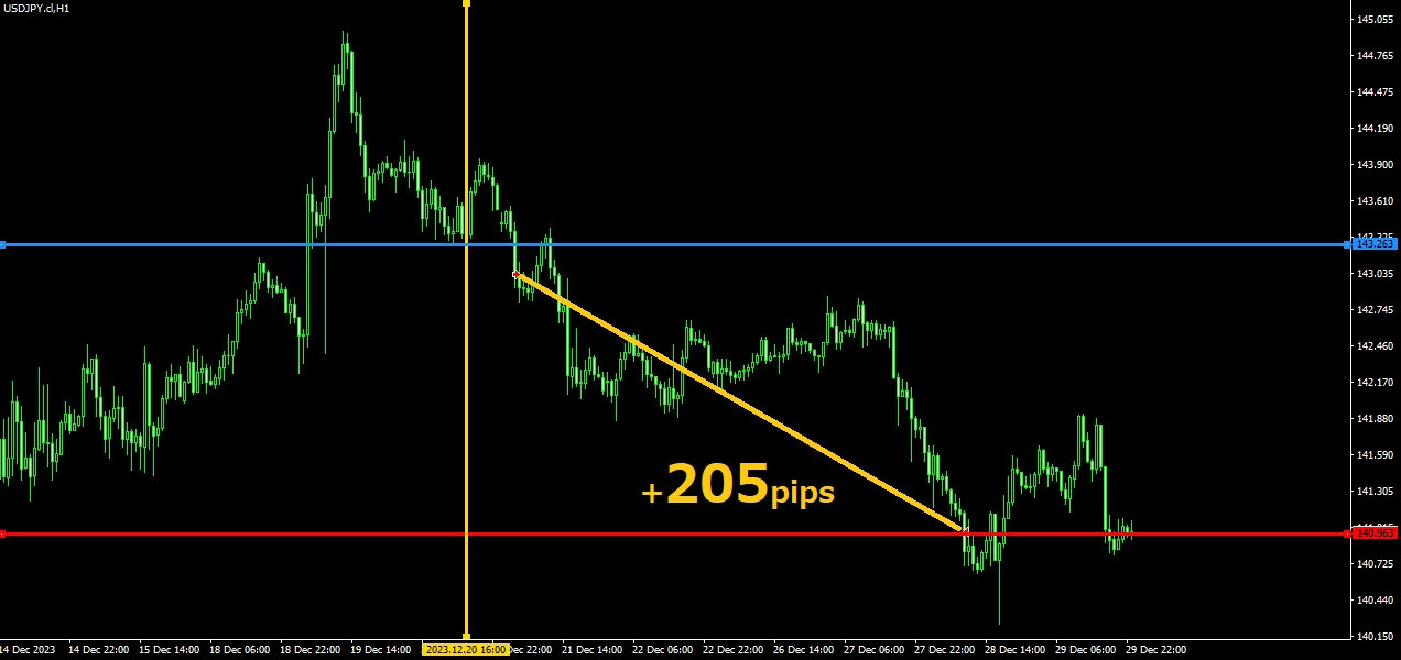 2023年12月21日~28日ドル円1時間足でのトレードです。 12月20日の時点で手法に合わせてラインを引いてEAをセットしています。 青色で示したレジスタンスラインをブレイク後、赤色で示したサポートラインまで下落し+205pipsの利益となりました。エントリー時間は日本時間の11時です。兼業トレーダーであれば難しいタイミングの取引ですが、手法に合わせて空いた時間にEAを設置することができるので、取引時にチャート見ていなくても利益を得ることが出来ます。