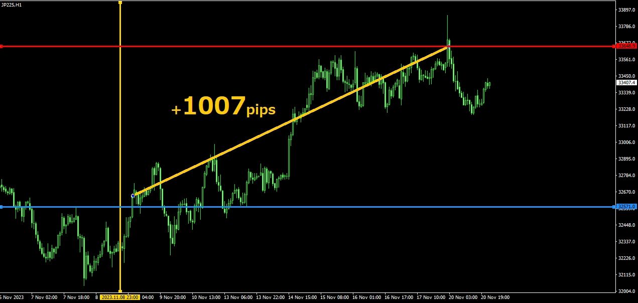 2023年11月9日~20日の日経225の1時間足でのトレードです。 11月8日の時点で手法に合わせてラインを引いてEAをセットしています。 青色で示したレジスタンスラインをブレイク後、赤色で示したサポートラインまで上昇し+1,007pipsの利益となりました。エントリー時間は日本時間の14時です。このトレードも兼業トレーダーであれば難しいタイミングの取引ですが、手法に合わせてEAを事前に設置することができるので、取引時にチャート見ていなくても利益を得ることが出来ます。