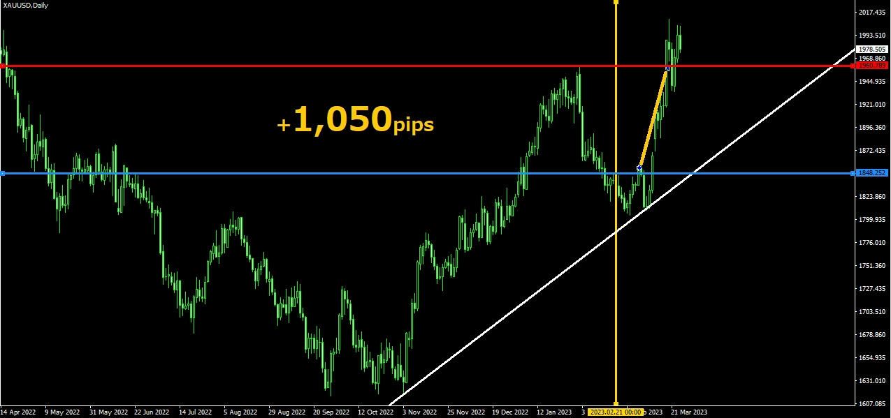 2023年3月6日~3月17日のゴールド日足でのトレードです。 2月21日の時点で手法に合わせてレジスタンスラインを引きEAをセットしています。 獲得pipsは+1050pipsでした。上記二つのトレードと異なる点は、トレンドラインに対する押し目でEA設置の判定が出来ている事です(分かりやすい様にトレンドラインを引いていますが、実際にはトレンドラインは引かずに判定できます)。単純にレンジを意識したブレイクアウトだけでなく、トレンド相場での押し目も本手法であれば狙うことができるのでトレードチャンスは多くなります。