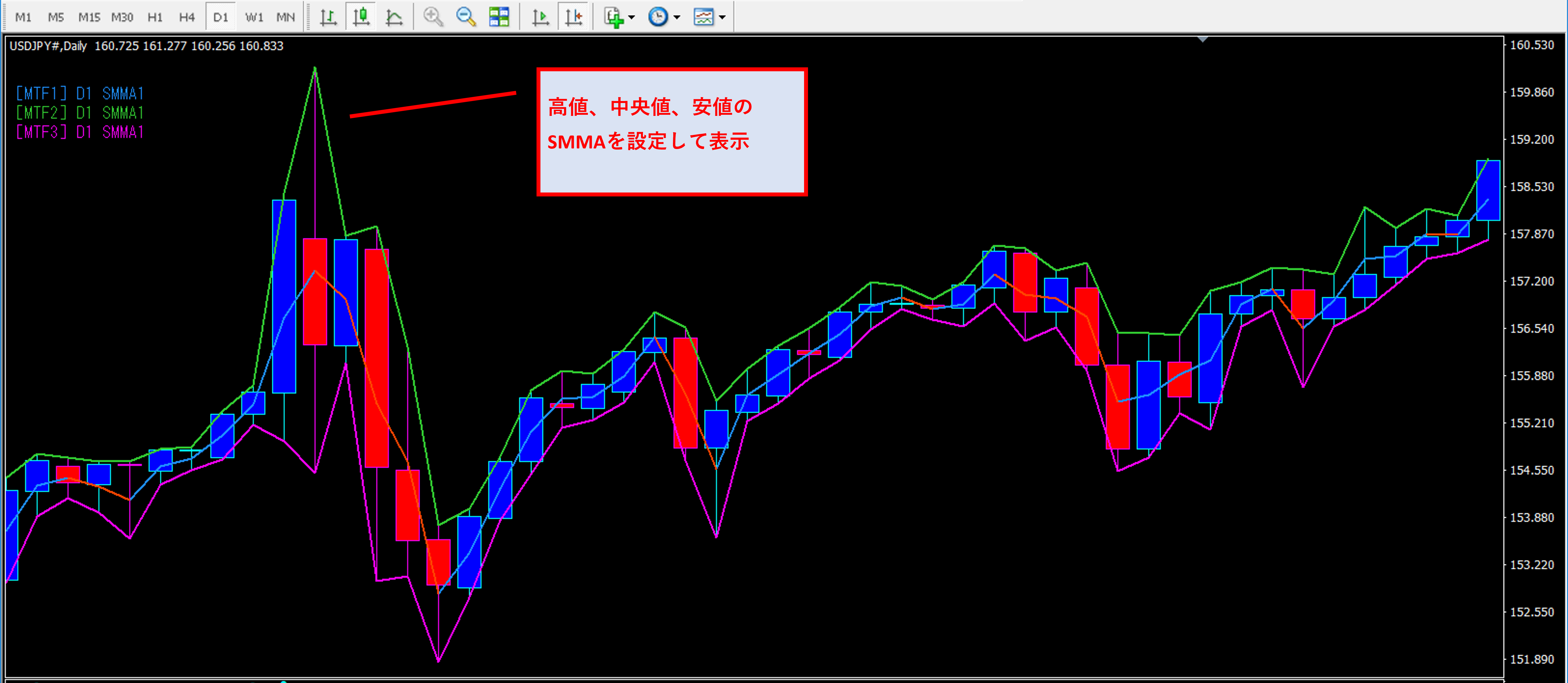 シンプルかつ王道のトレード手法の移動平均線(MA)を3ライン同時にマルチタイムフレーム表示!