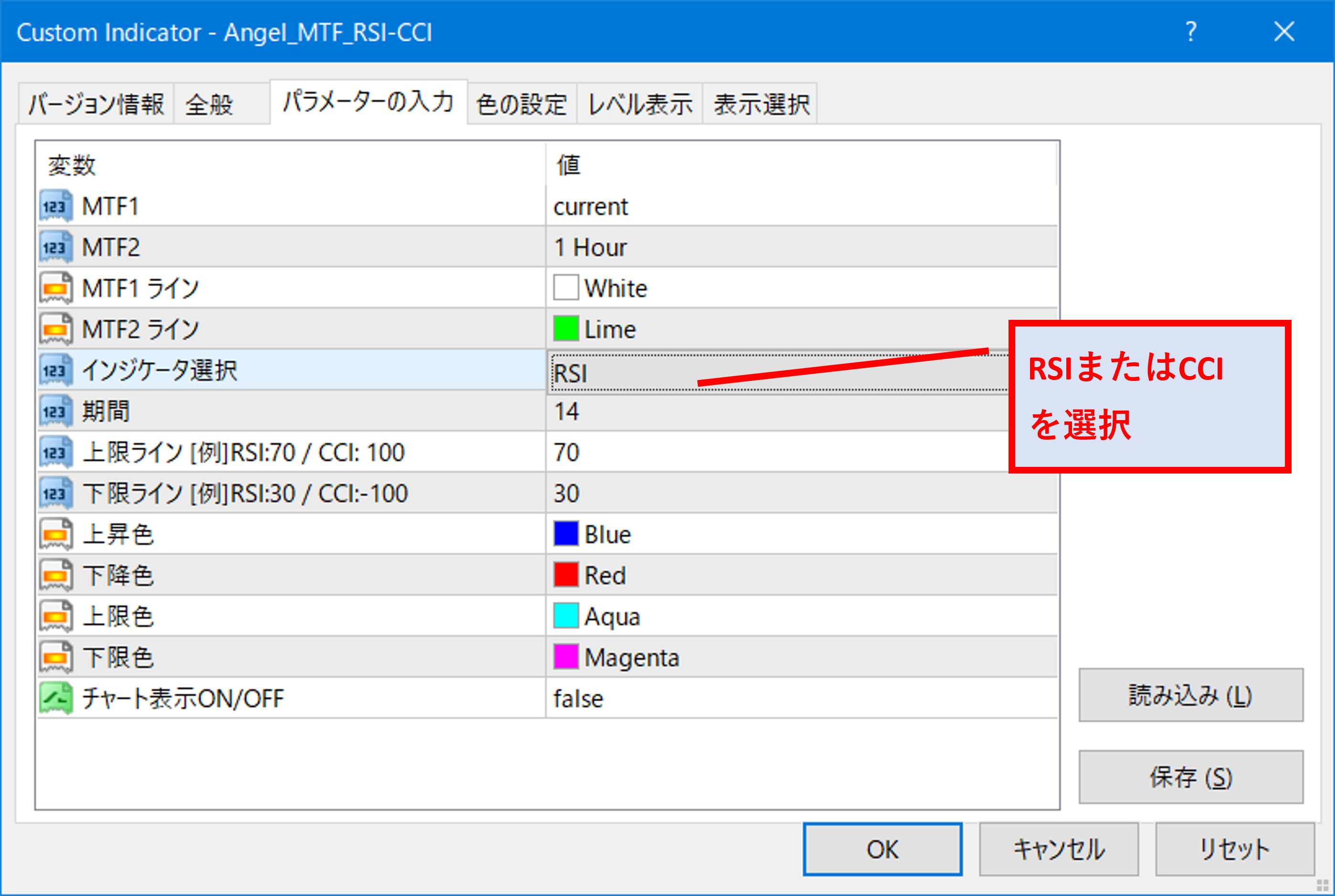 ・インジケータ選択はRSIまたはCCIのどちらかを選択してください。(同時に表示はされません)