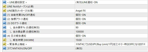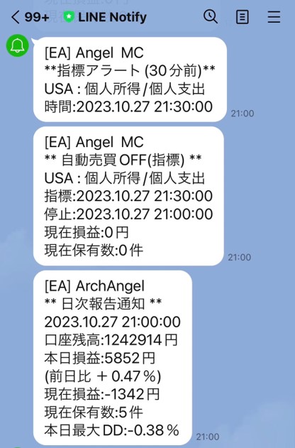 ・日次報告通知(指定時間に口座残高、本日損益、本日最大DD等を通知)