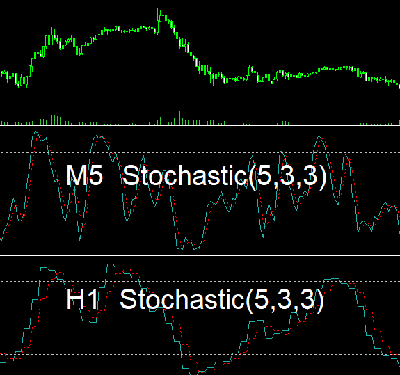 自分が見ているチャート上でより上位の時間足のストキャスティクスを表示することができます。