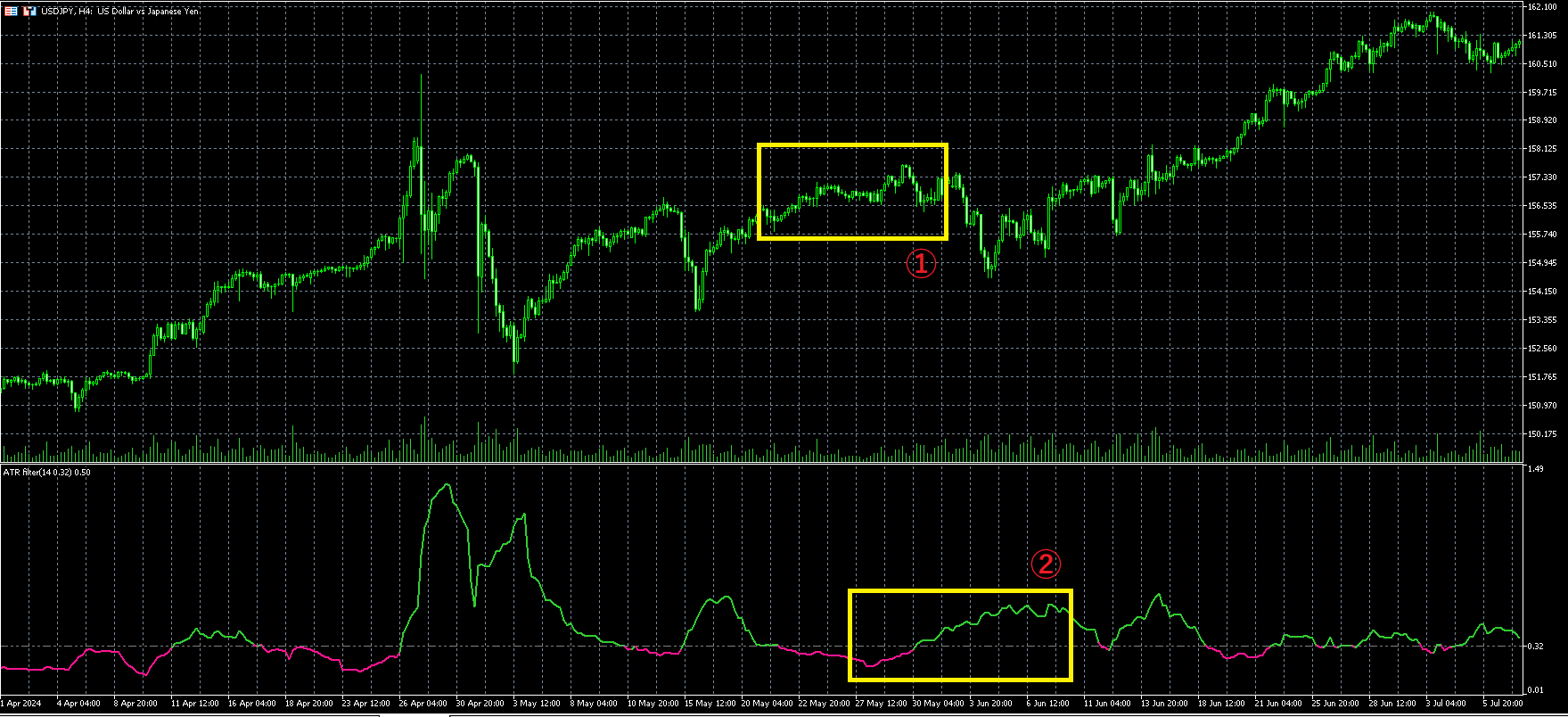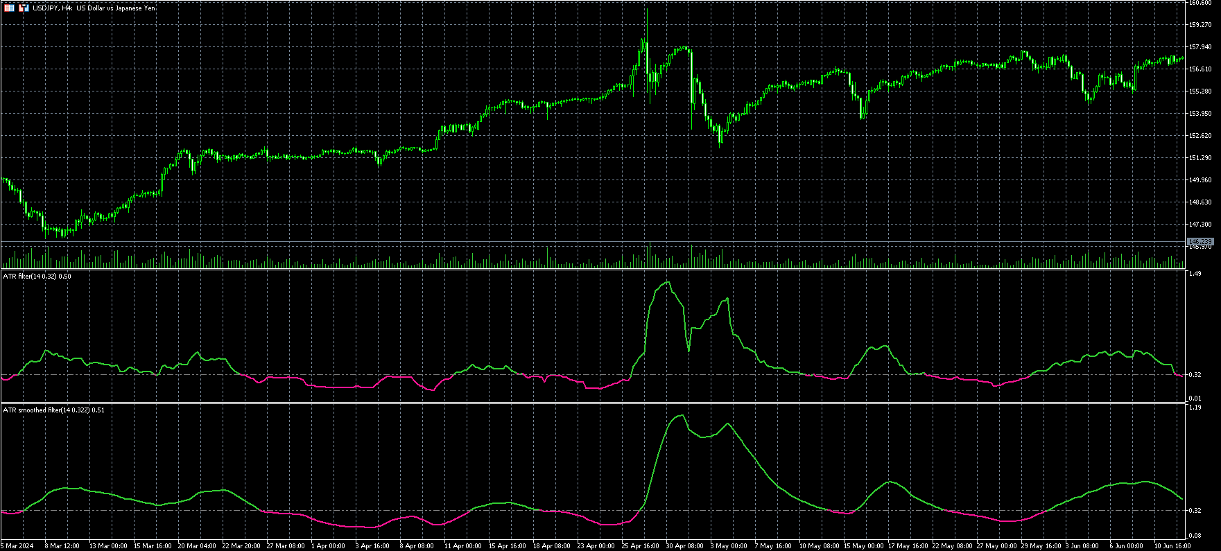 一番上にあるのは先ほど紹介していたインジケーター”ATR filter”になります。その一つ下にあるのはそのインジケーターを平滑化した”ATR smoothed filter"になります。