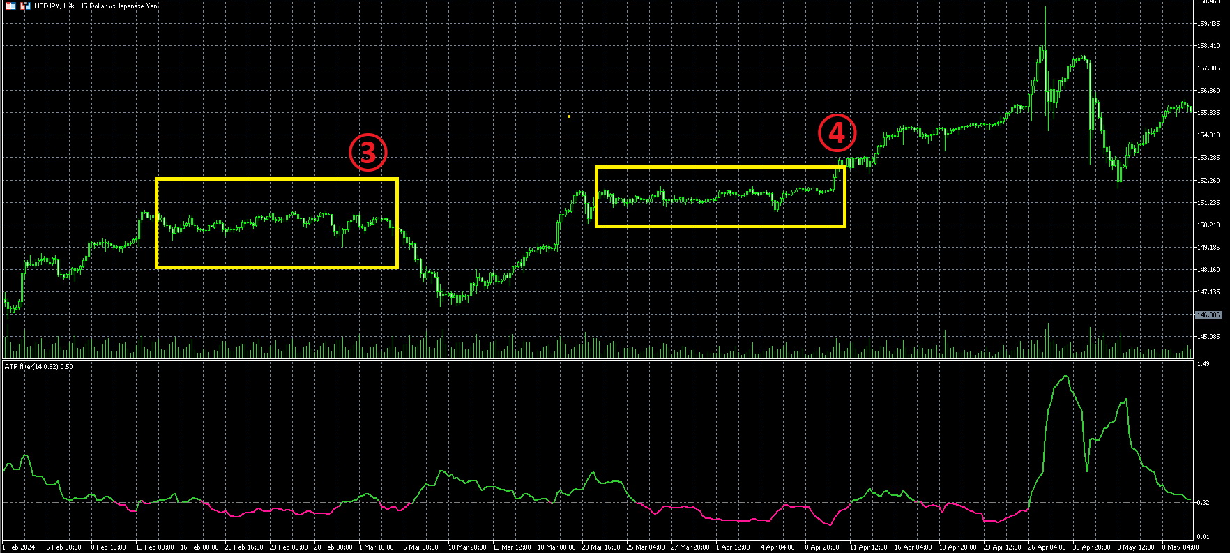 ④こちらも③と同様にレンジ相場と分かると思いますが、インジケーター部分に注目すると最後の方で急激に上がっているのが分かると思います。これは、急変動が起きたときに起きる現象でここから二種類の考えられます。一つ目、先ほども触れましたが、上値や下値が重い状態こちらは先ほどの内容にかぶるため省略します。二つ目、何かしらのブレイクアウト。こちらの場合は、直近が期間の長いレンジ相場であったこともあり、上抜け成功による上昇が確認できます。