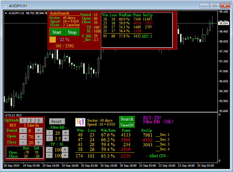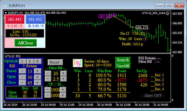 | 「1セクターあたりの期間 = 40日」×「4セクター」を集計しています。 左から、「勝ち数」、「負け数」、「勝率」、「獲得ポイント」です。 最下部のライン下では、4セクタ(4期)の合計を表示しています。 |