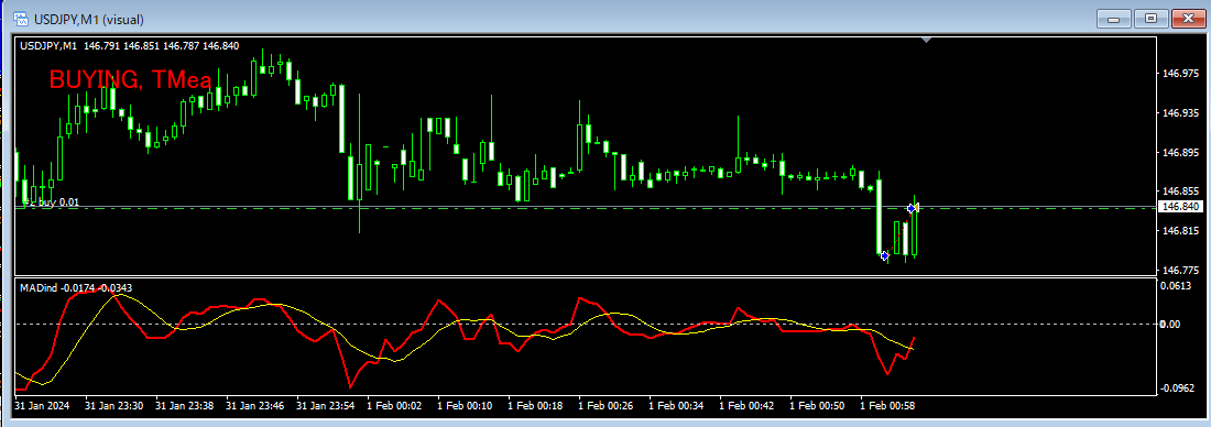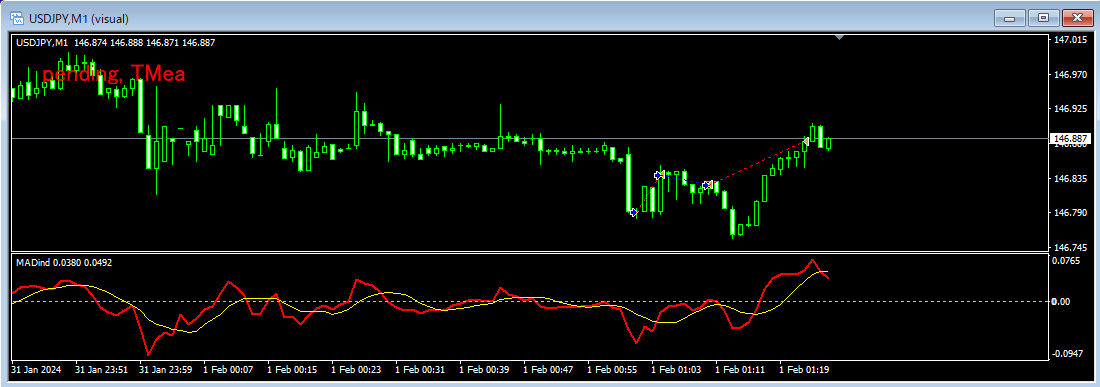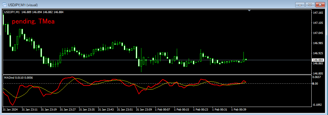 ストラテジーテスターのビジュアルモードで TMea の使い方を説明します。下図は注文が出ていない通常の画面で pending, TMea と左上に表示されています。サブウィンドウにはおまけとして付けました MADind (移動平均乖離のインディケータ) が表示されています。MADind についての詳しい説明は別売しておりますインディケータ 「MADind  MACD より早くて使いやすい (アラーム付き) 」の商品概要をご覧ください。