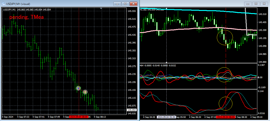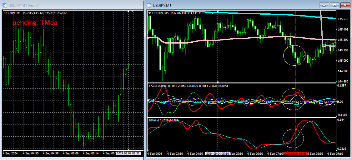 左はストラテジーテスターの 1 分足チャート、右はテクニカル分析の 5 足チャートです。ストラテジーテスターを灰色点線のところで停止して右のチャートの灰色点線より先にあるエントリーポイントを探します。この場合は VWAP, ローソク足がパーフェクトオーダー、USDJPY が最弱通貨ペアになり BBWind が上昇を開始するタイミング (丸印) を売りのエントリーポイントとすることにします。バックテスト用のスクリプトSell_time_TM をそこにドロップしますと赤の破線が出て一回目の売買の時刻と方向を指定することができます (買いの場合はスクリプト Buy_time_TM をドロップ、緑の破線となります)。その後、ストラテジーテスターの停止を解除します。下図のようにトレードが終わったら再度停止して次のエントリーポイントを指定するということを繰り返します。