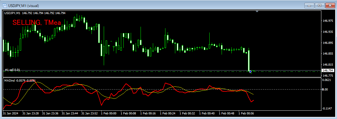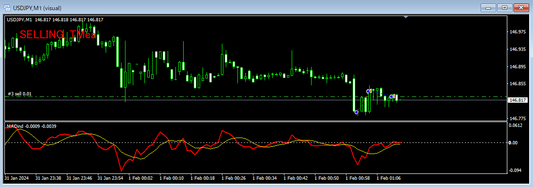 下方ブレイクしたところで Sell_ order_TM スクリプトをチャートにドロップしますとグローバル変数を介して指令が EA に送られ、即座に売り注文が実行されます。左上の表示は SELLING, TMea に変わります (下図)