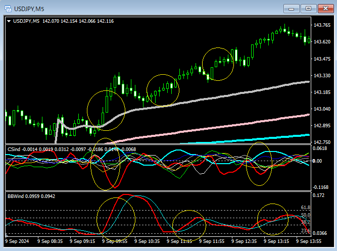 メインウィンドウには上から欧州市場、アジア市場、北米市場開始時刻起点の VWAP (出来高加重平均) が並んでいます。ローソク足はその上にあり、いわゆるパーフェクトオーダーとなっています。丸印で示したようなところでエントリーします。上のサブウィンドウは主要な 7 通貨の強さ (CSind) を示しています。USD (水色) が最強、JPY (が最弱になり USDJPY が最強の通貨ペアとなった丸印で示したようなところでエントリーします。下のサブウィンドウはボリンジャーバンドの幅 () とその平滑化シグナル (水色) を示していてボリンジャーバンドの幅が拡がり始めた丸印で示したようなところでエントリーします。