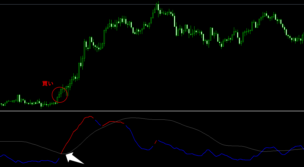 赤の時は価格が強い「上昇」、緑の時は価格が強い「下降」状態であることを示しています。