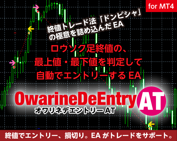 「OwarineDeEntryAT」は直近の指定した範囲で、ロウソク足の「終値」の上値、下値を抵抗線と見て、最新のロウソク足の終値がその付近に来た(ドンピシャ発生)らエントリーし、指値・逆指値を設定して損切り・決済まで行うことができるMT4で動作するEAです。