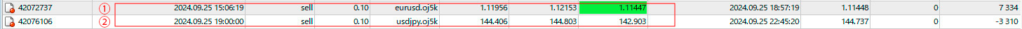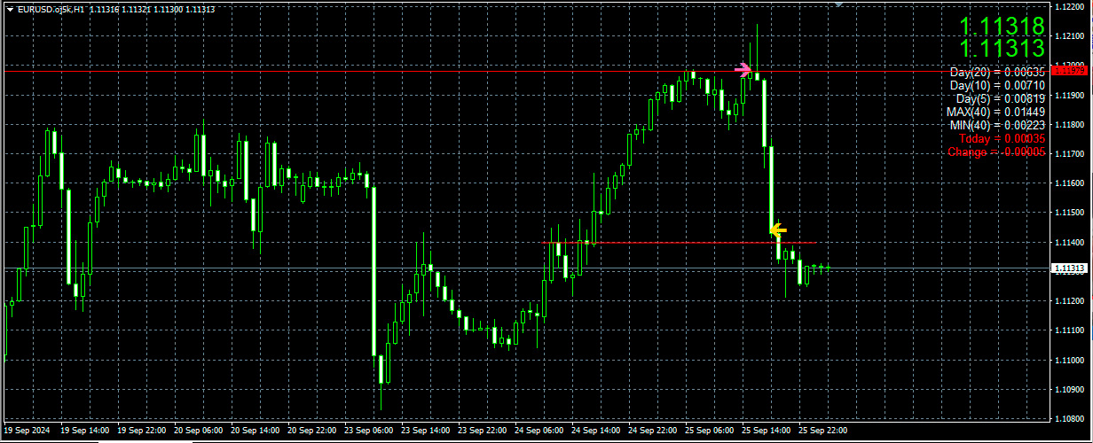 ①について、【ピンクの矢印】ユーロドルで直近の上値とほぼ同位置でロウソク足の終値がきて「ドンピシャ」発生。OwarineDeEntryATが自動で売りでエントリー。その後下げて行った。指値を直近のフシの上あたりに入れていたらひっかかって利食い【黄色の矢印】